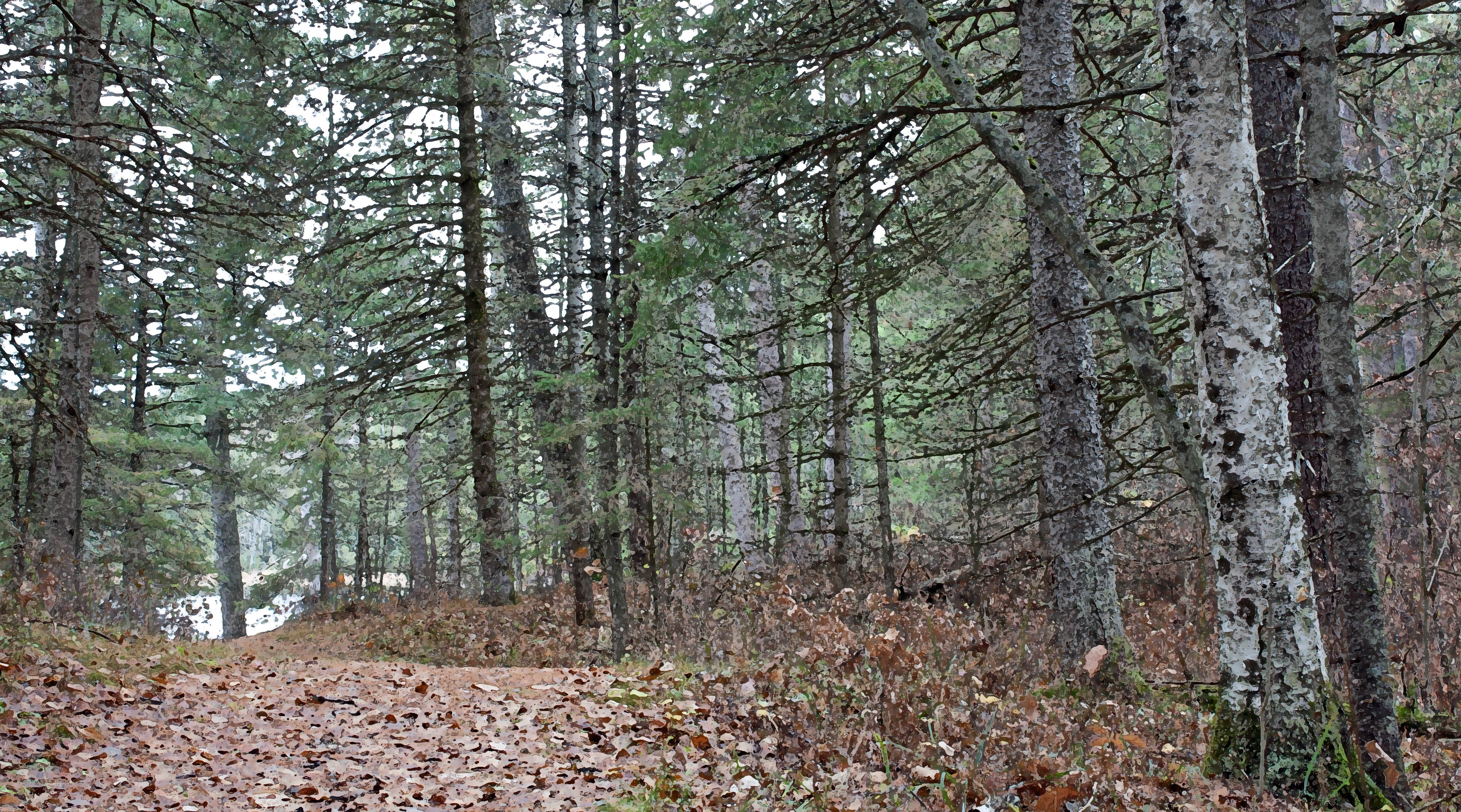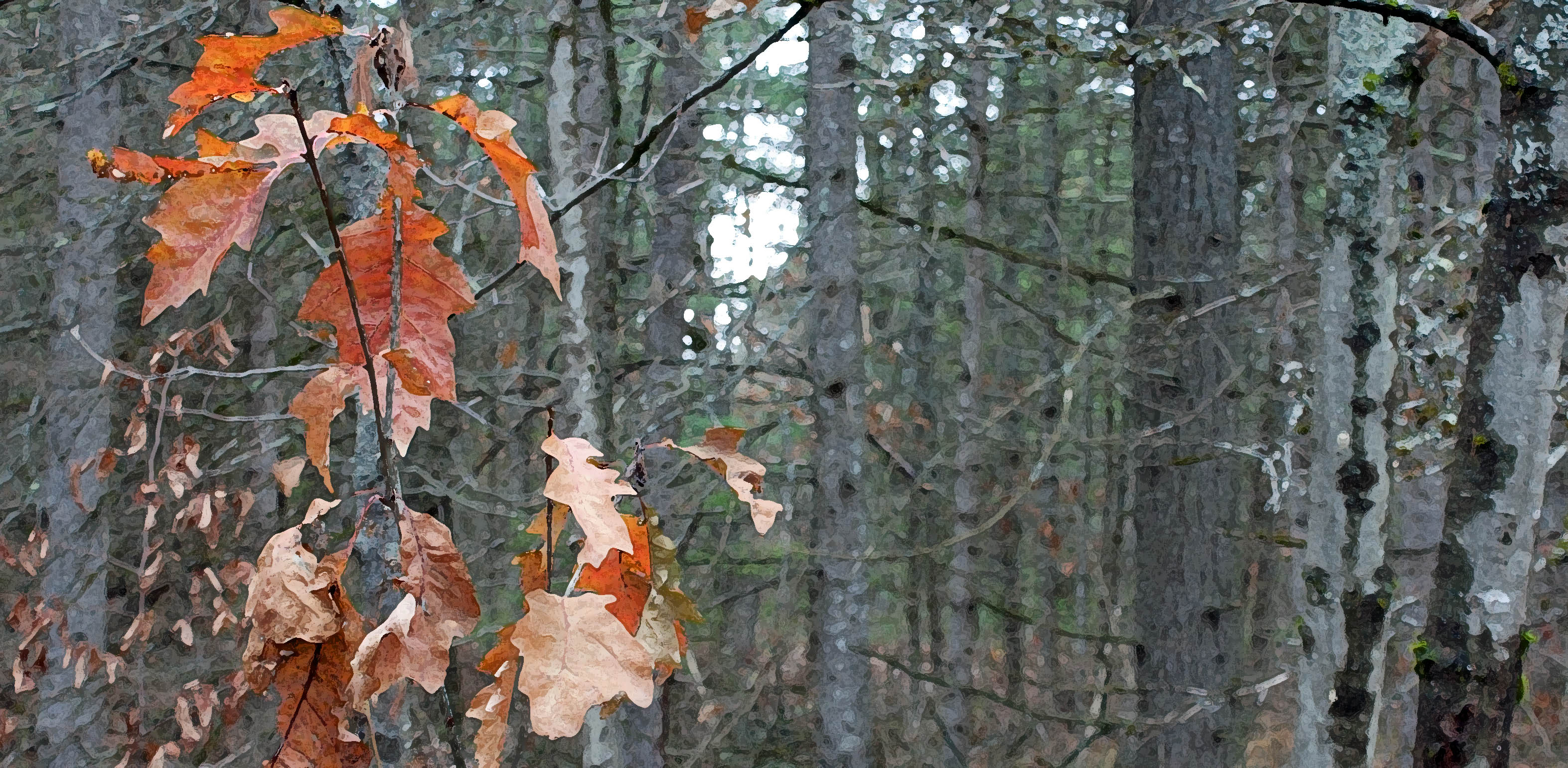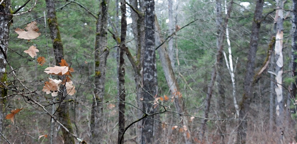 It’s early winter, when the chill winds carve through mixed forests in a restless howl, snatching leaves of deciduous trees and sending them flying. But in this primeval ancient forest of evergreens, the few deciduous trees mimic their conifer cousins by stubbornly clutching their leaves. In winter, the leaves of oak and beech trees cling to their branches, marcescent. To the silver greens of pine and hemlock, they add flames of copper and gold.