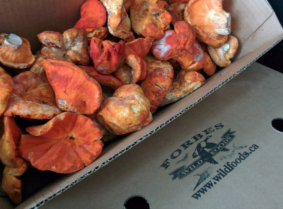 The short-stemmed russula can also be parasitized by the fungus Hypomyces lactifluorum; these parasitized mushrooms are commercially harvested and sold as “lobster mushrooms”. Forager Chef Alan Bergo, who has been hunting and cooking them for over a decade shares that the lobster mushroom (either Russula or Lactarius) has a subtle shellfish flavour that is easy to identify with no look alikes. Bergo shares that in Mexico, where they are sold at local farmers markets, they are known as Tromba de Puerco or pork horn, based on their vase-like shape and because they are cooled as a meat substitute. “They are usually boiled, then fried with tomatoes and onion, eaten with tortillas,” says Bergo.