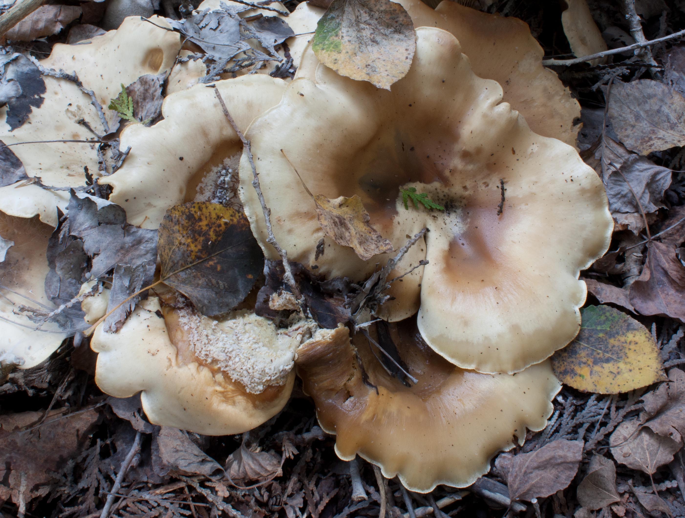 Ranging from four to seven inches across, their mushroom caps were mostly cream-coloured, and depressed in the middle. Some were browning on the edges and centre. These were all fairly mature, I thought, with smooth and rather wavy margins and whitish gills that descended down to (decurrent on) a short thick stubby stem.