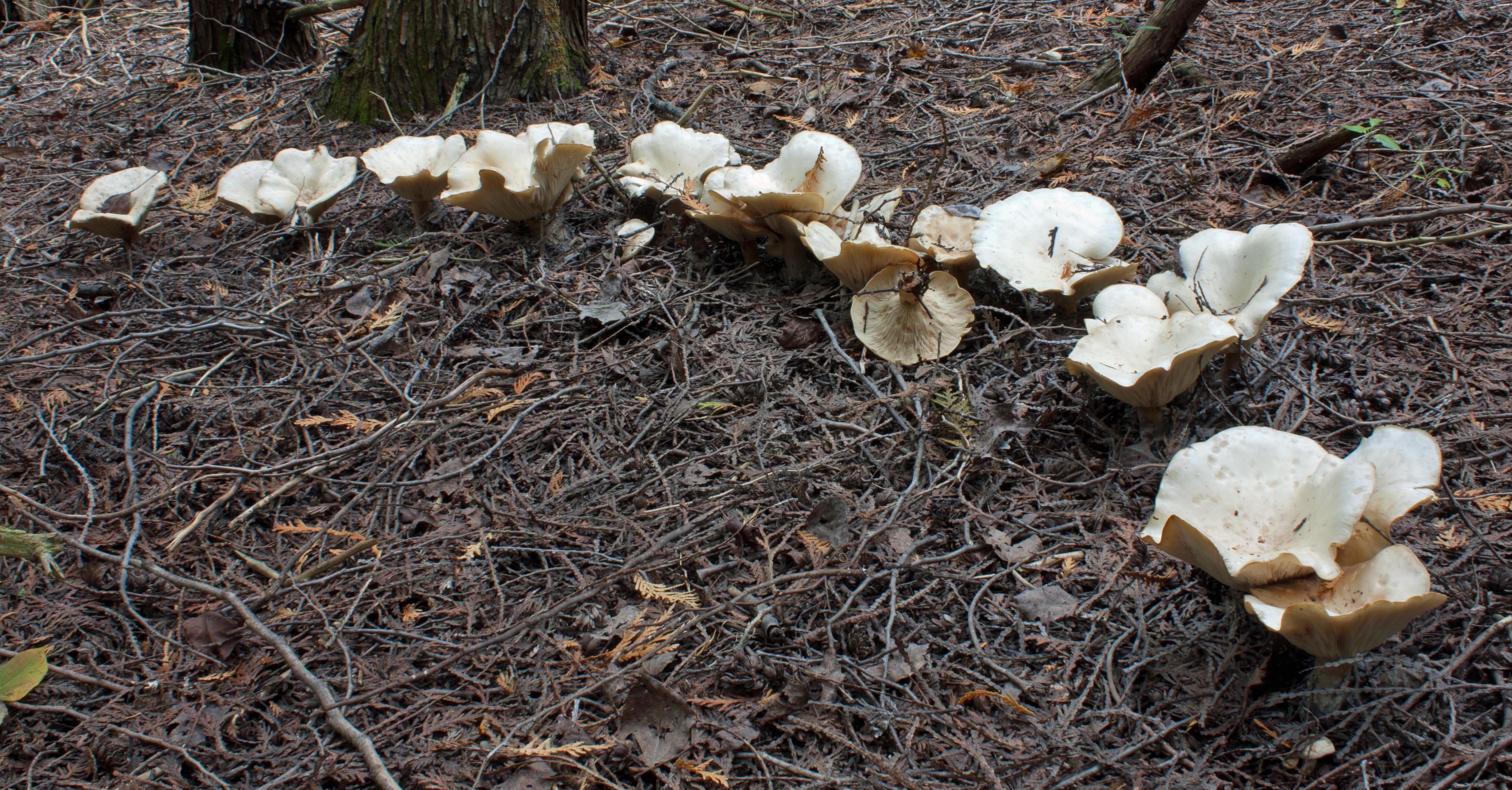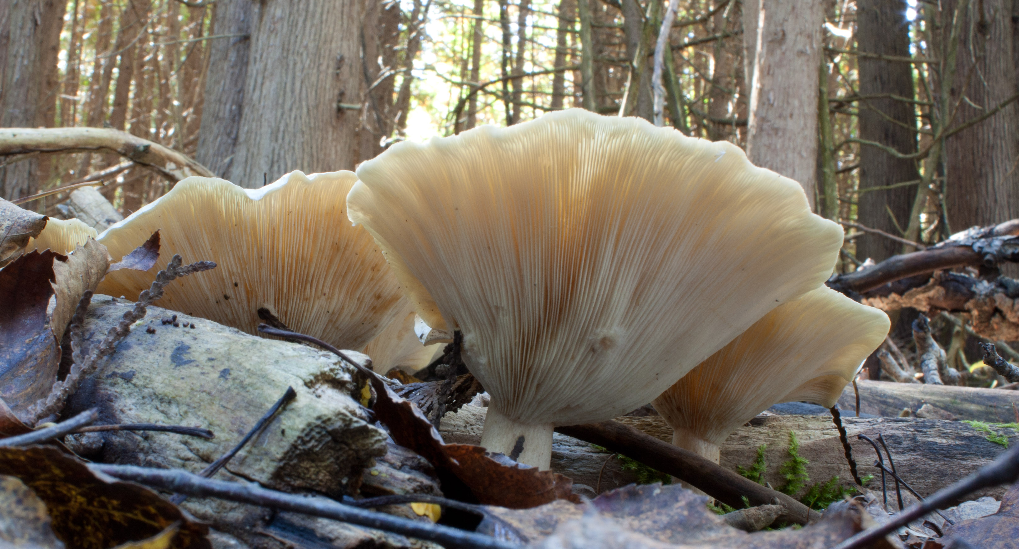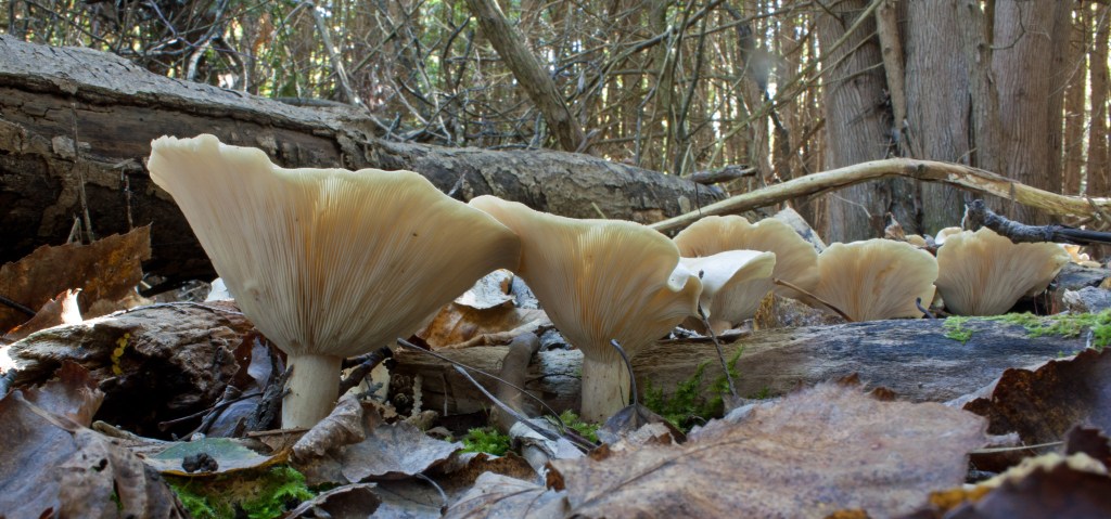 It was early October on a warm gentle day when I chose to walk a different path in the Trent Nature Sanctuary forest. And there, in the cedar-birch-poplar forest, I discovered beautiful fanned-shaped saprotrophic mushrooms arranged like street trees on a boulevard and stitching an enchanting network of crisscrossing lines of creamy ‘flowers’ on the forest floor. I noticed that they were arranged in close to what looked like a fairy circle in the thick duff amid dead logs and branches of several fallen poplar and birch trees; no doubt obtaining their nourishment from the decaying wood.