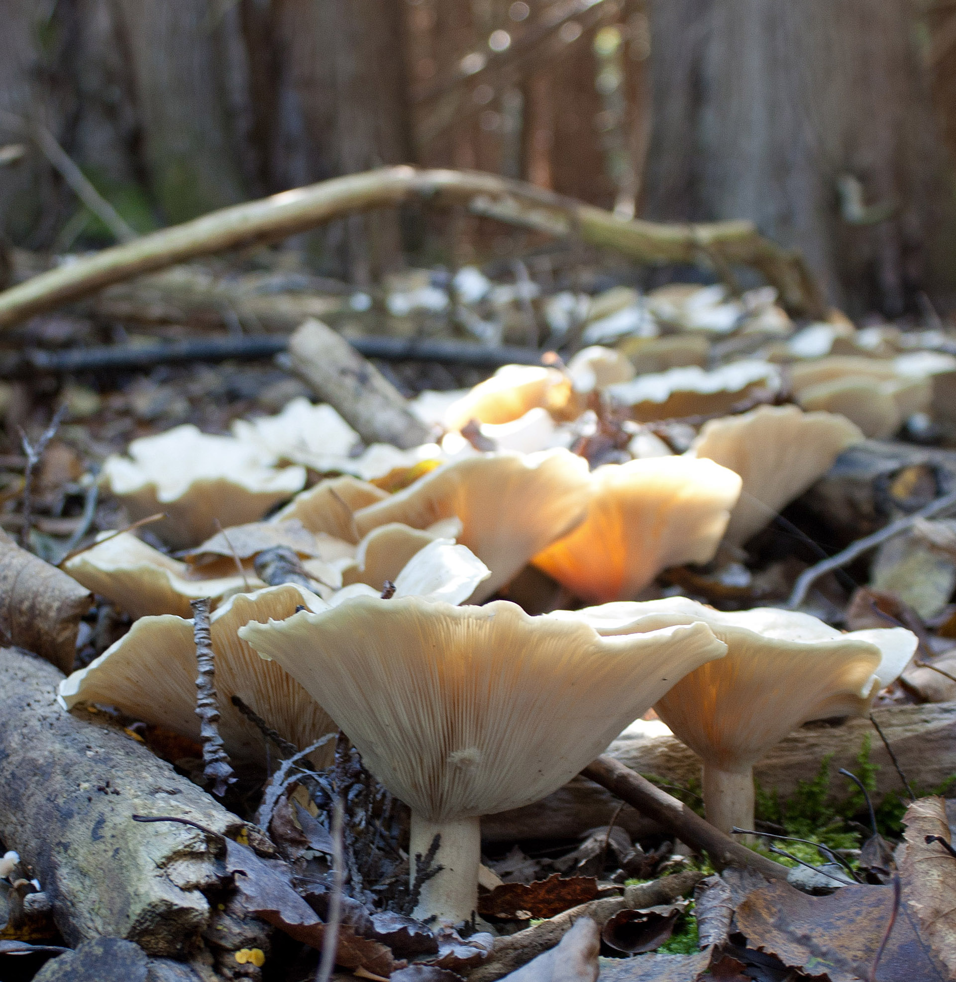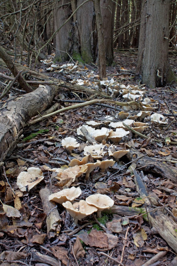 BUT… Jenny at Mushroom Appreciation describes both P. populinis and P. ostreatus as “mild and mushroomy, sometimes with a light licorice scent.” I detected no light licorice scent; while my specimen smelled ‘mushroomy’, it also gave off a rather pleasing sweet fruity-floral, almost vanilla, fragrance. I also thought it odd that all the mushrooms I found were thrusting out of the ground beside—not on—the fallen trees. Their gills also did not clearly run down the entire stem as they do in true oyster mushrooms. So, I abandoned the oyster and continued my search…