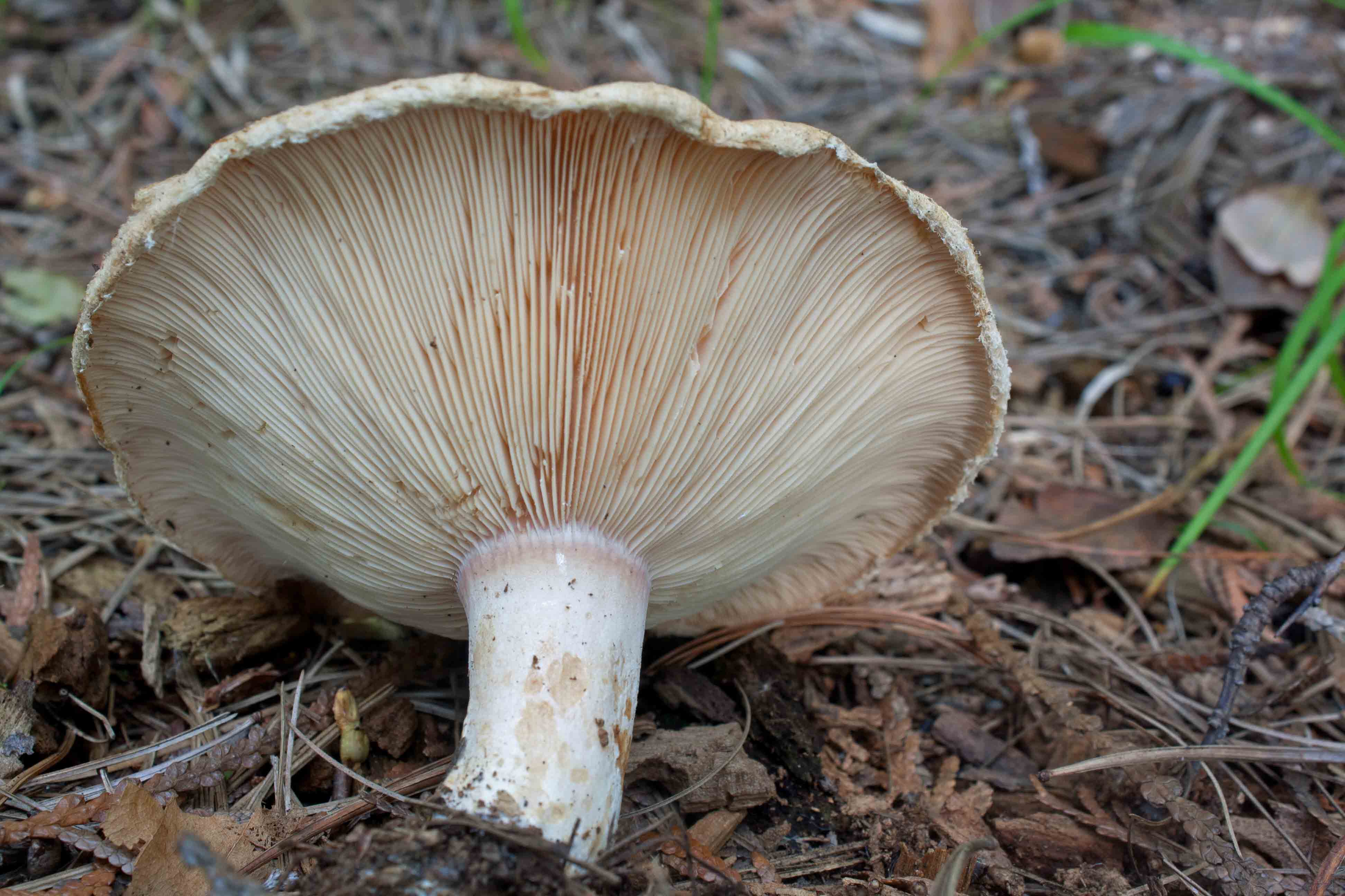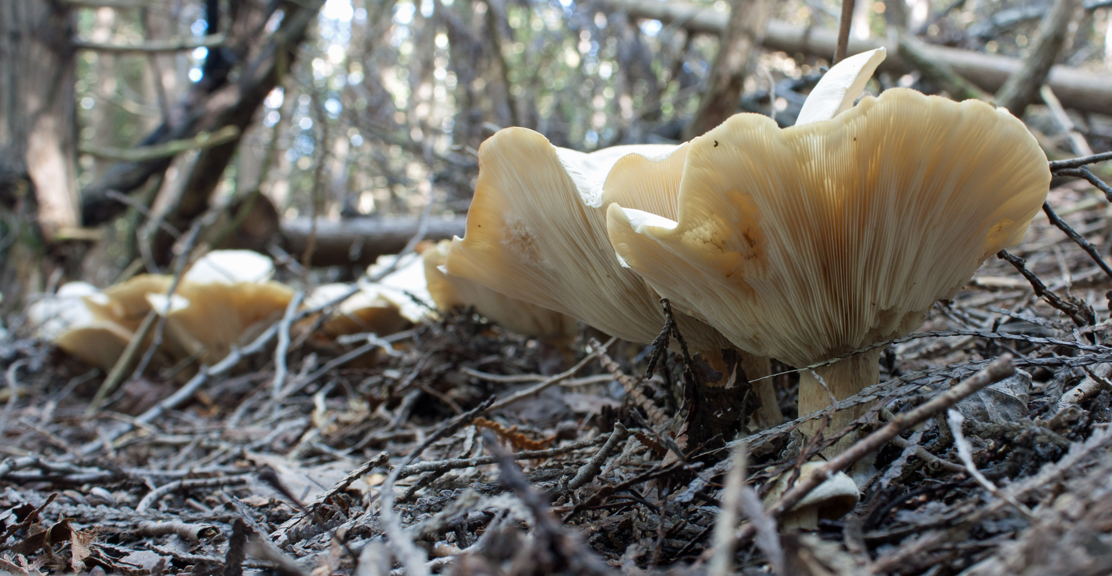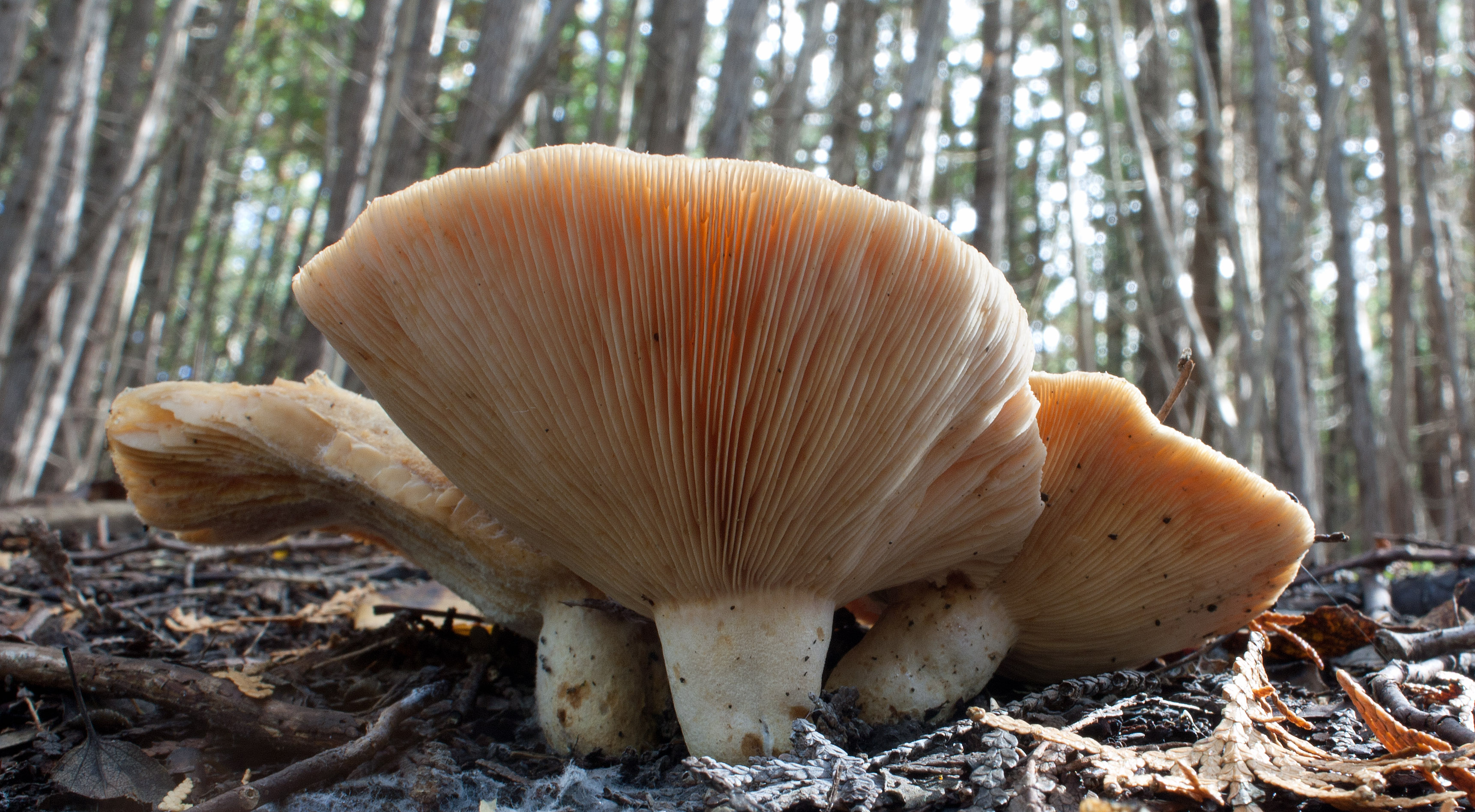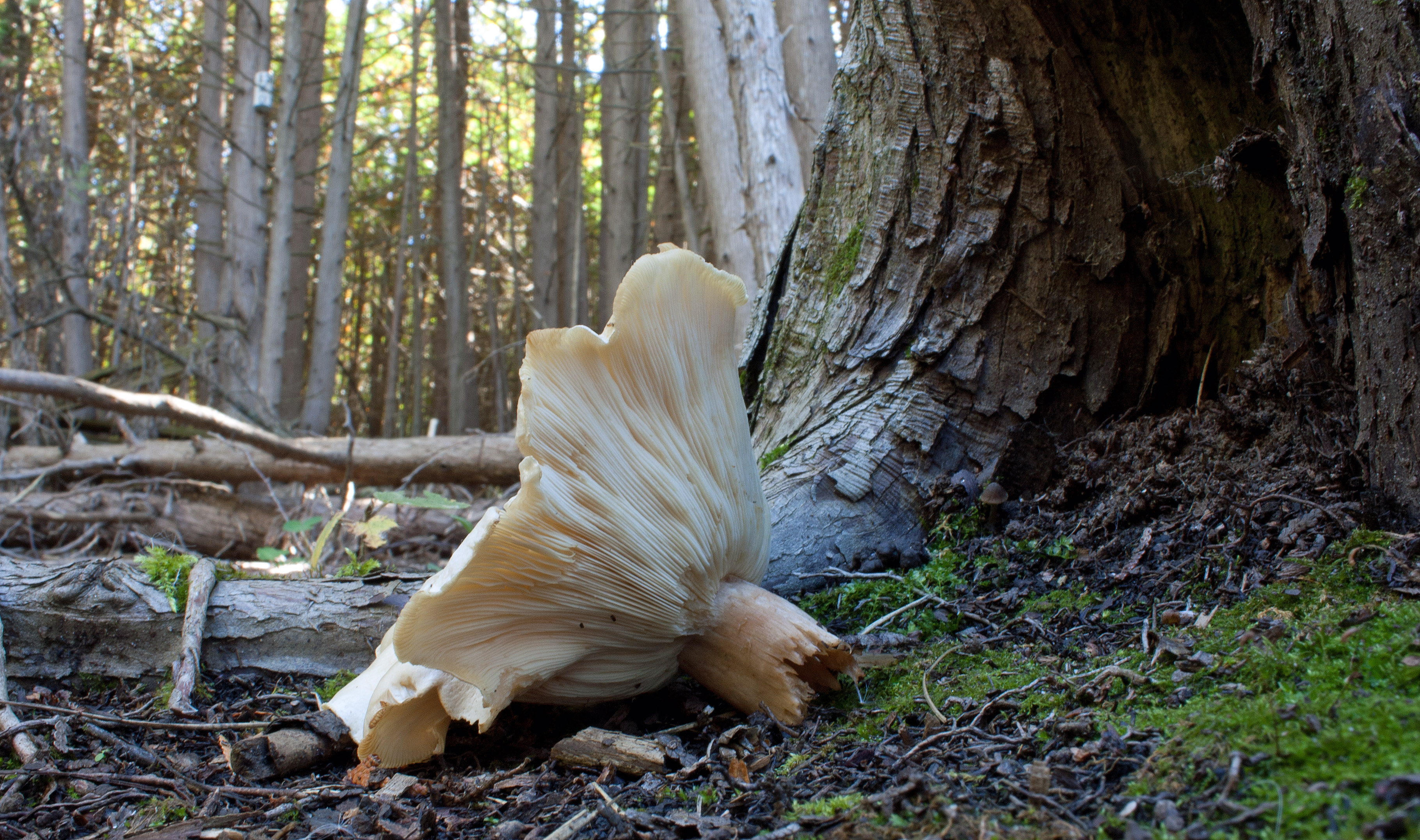 My search came across the milk cap mushroom, commonly found in woodlands in Ontario. Their description of morphology and micro-habitat more closely matched the specimens I found. In keeping with their mycorrhizal associations, they were not restricted to trees, living on the ground under broadleaf deciduous trees (such as birch or beech trees) and sometimes conifers. Milk cap fruiting bodies become large, often with creamy-white caps more than 10 cm in diameter, depressed in the middle, and with shortly decurrent gills on the underside that end on an often stubby stem. Their scent depends on the species and varies from fruity to a distinctive coconut scent.