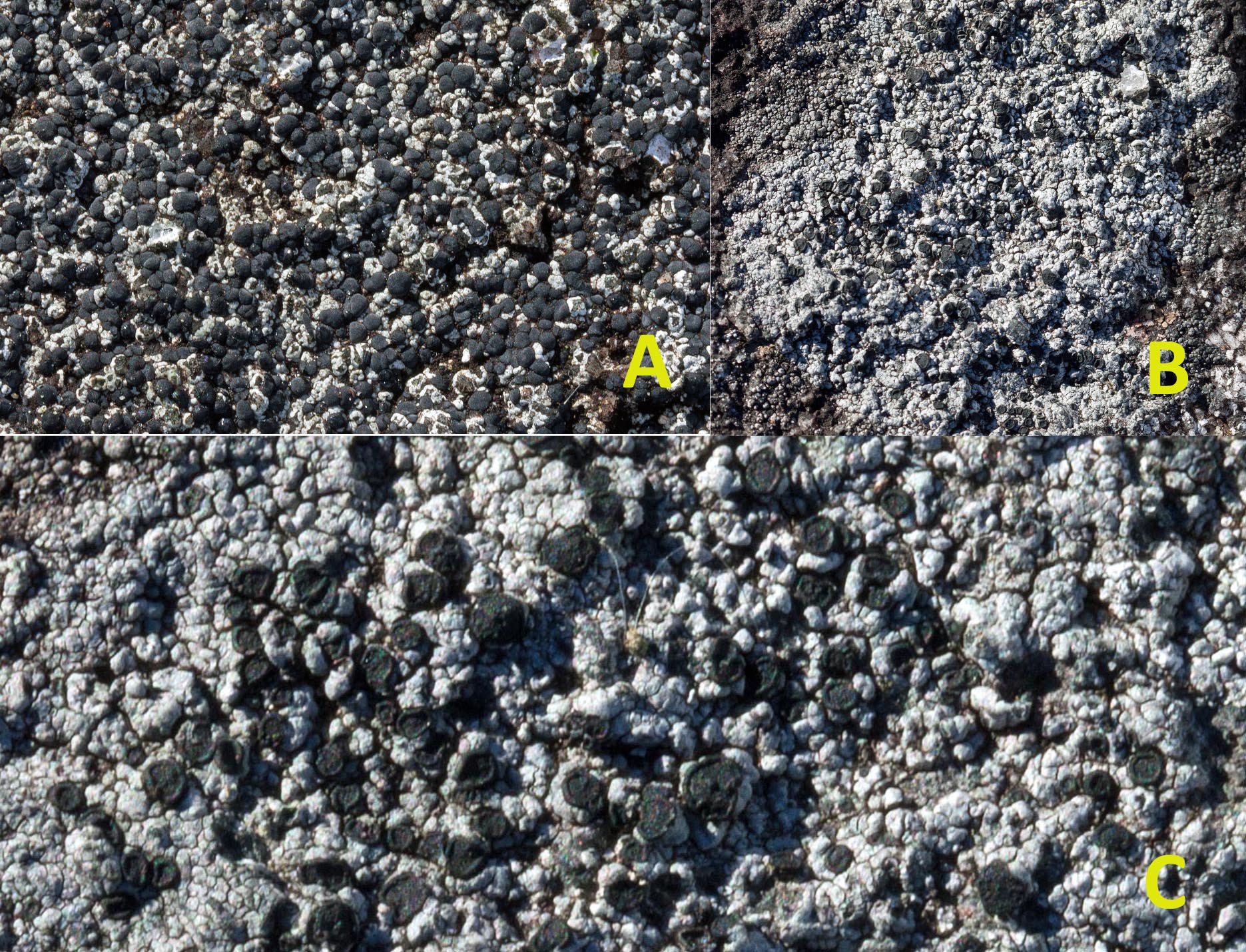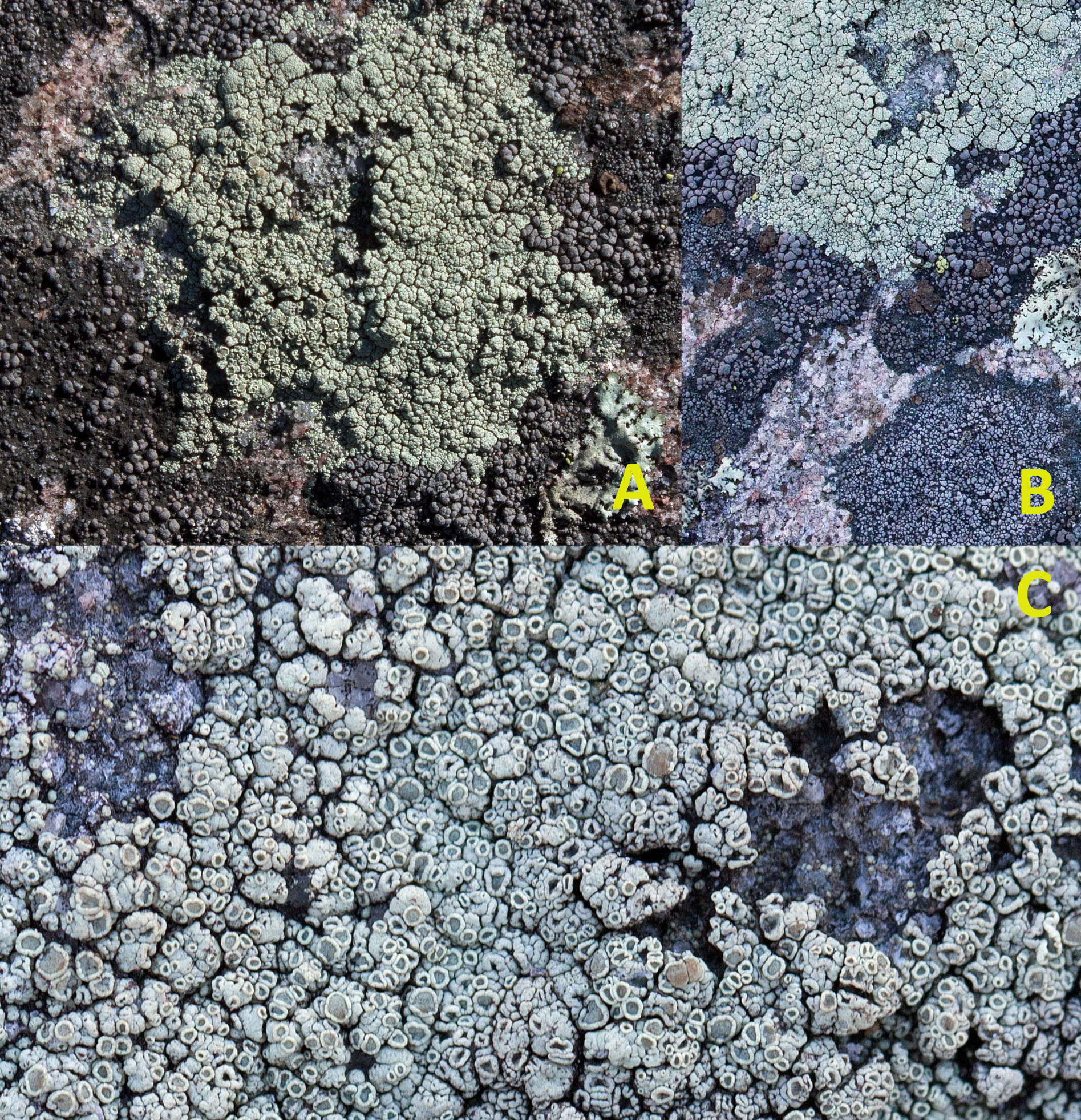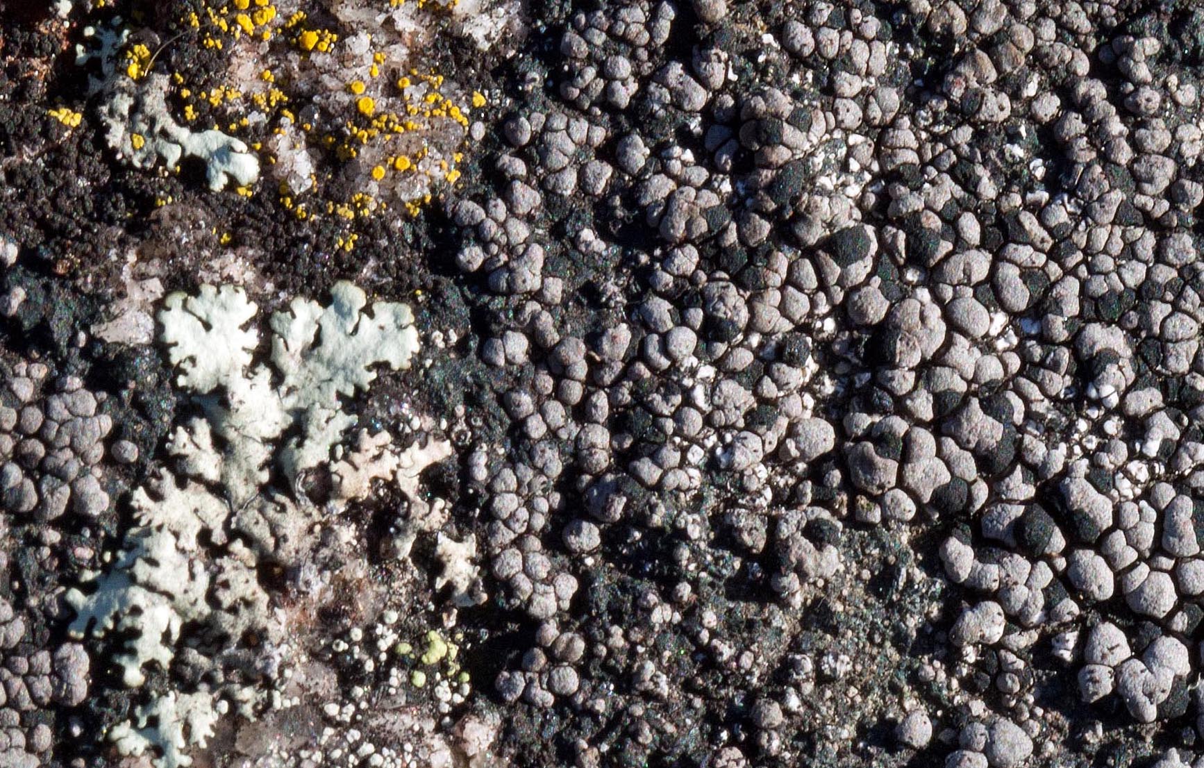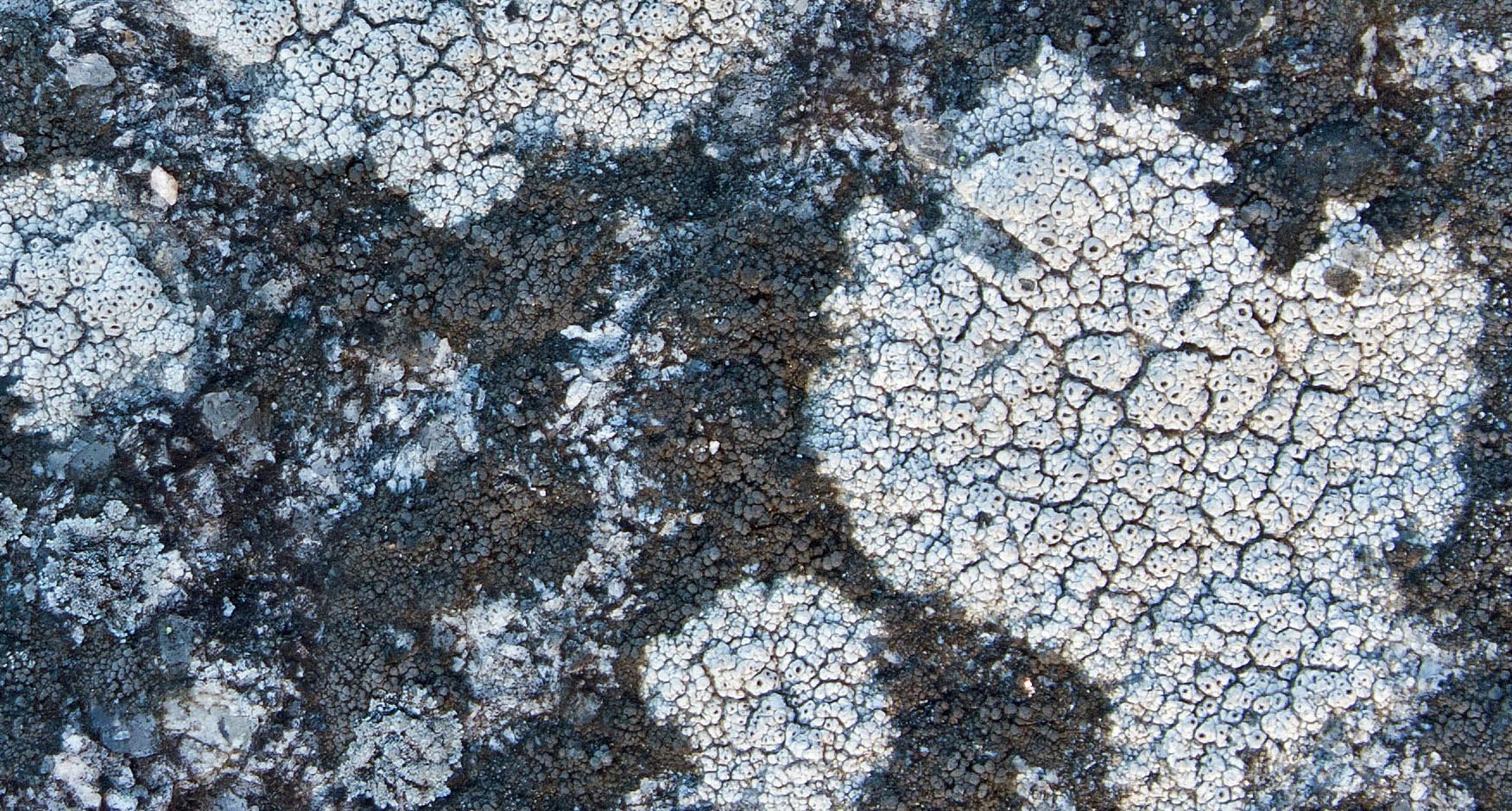 I saw one or both of these lichen on the granite surface amid other larger lichens that I photographed. In all cases, I only saw them in post-production among the rock crystals. They were so small and rare that I missed seeing them with the naked eye. Both of these tiny crustose lichen are common and live on granite rock. Common Goldspeck prefers sun-exposed areas, which is where I found it. Walewski notes that these two very common lichens are frequently overlooked. He advises to check for them amid the more robust foliose lichens.