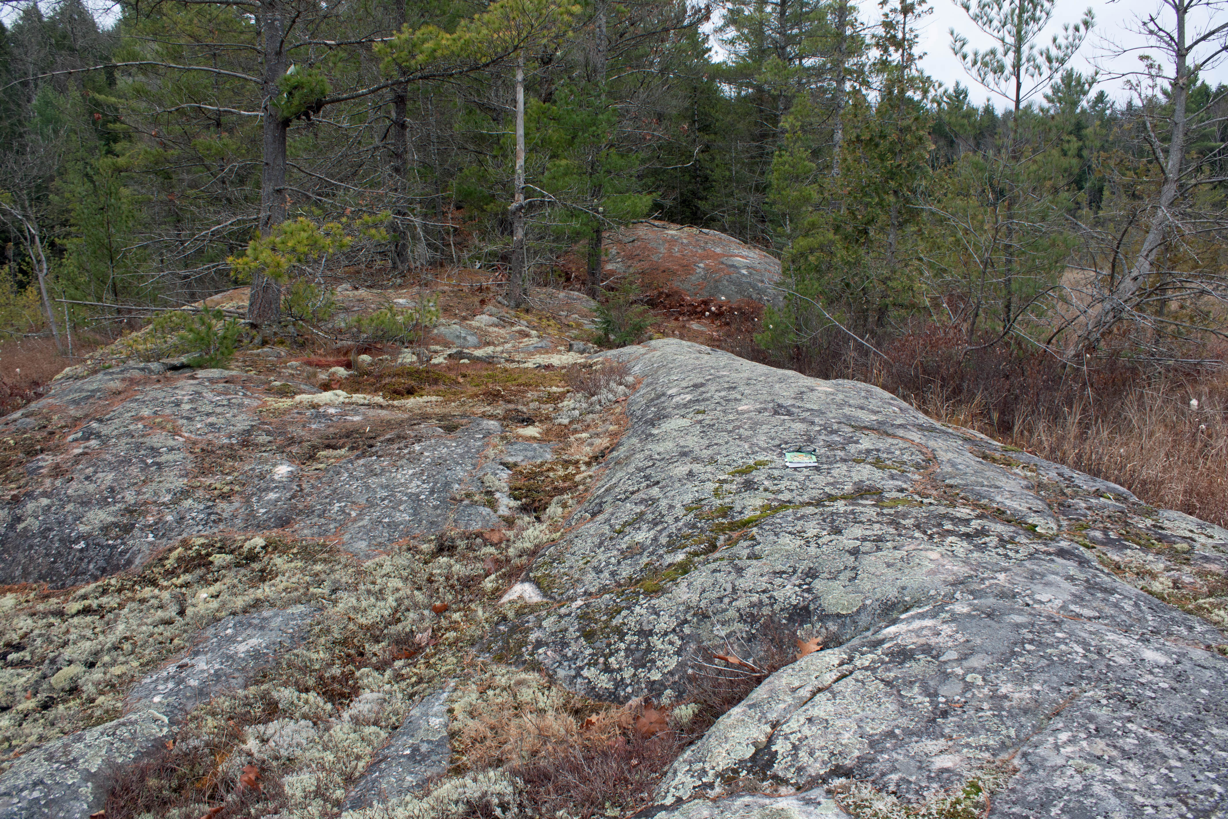 The rocky peninsula extends northward into the marsh for about 40 metres, much of which is covered in shallow humic soil and duff with several trees—pine, oak, birch and even beech—established. The northern-most tip of the rock outcrop is mostly bare exposed rock with hollows filled with debris, moss and lichen.