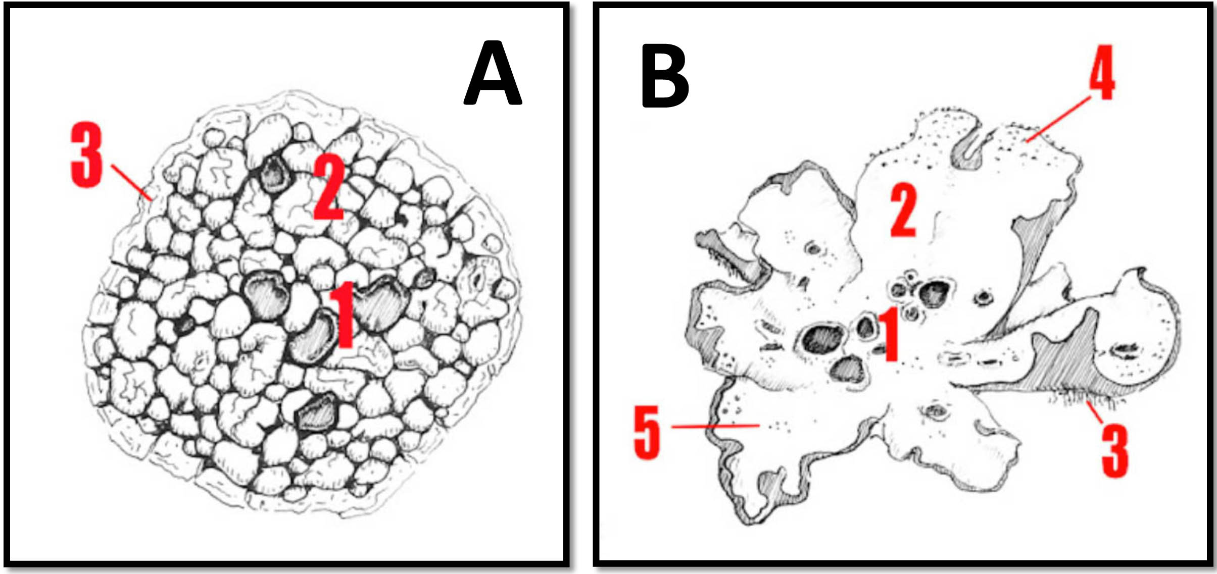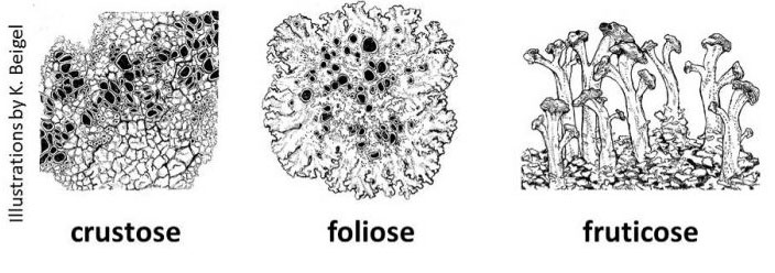 - For Crustose Lichen three main structures include: 1) Apothecia (fruiting bodies), typically cup or wart-shaped and often a different colour; 2) Thallus, which may be warty, wavy, or grainy, but always fused to the rock; Margin, the growing fungal edge of the lichen, a different colour and often black and flatter and less textured than the thallus.