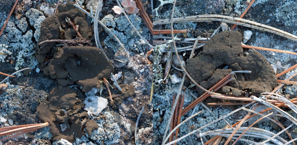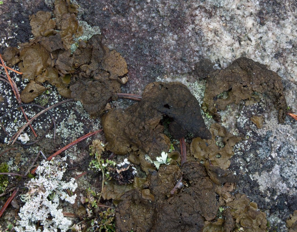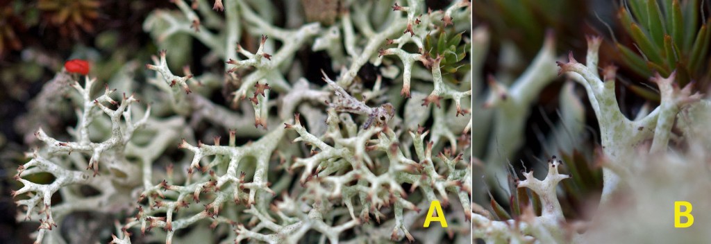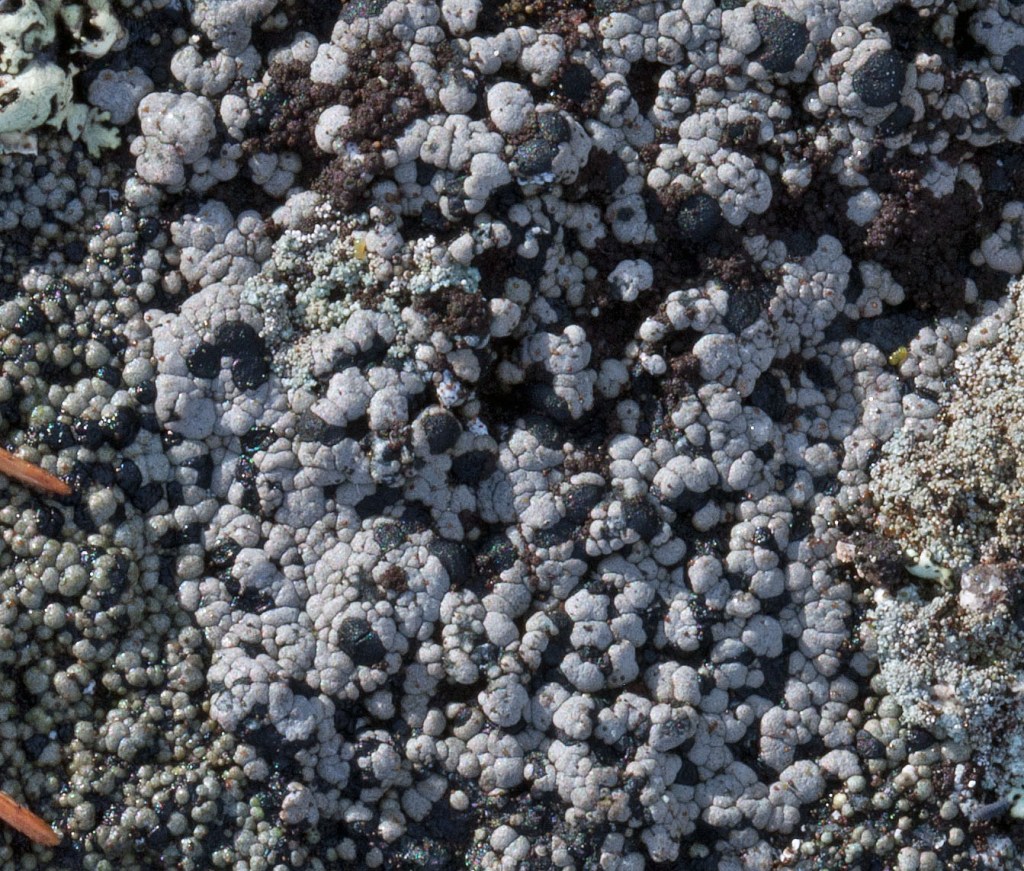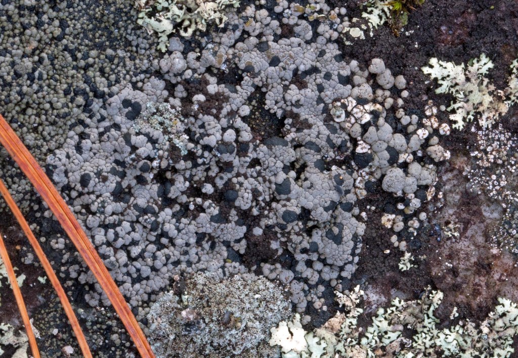 Rock Foam Lichen (Stereocaulon saxitile): I found small clusters of this snow lichen in some shady hollows but mostly in the upper sun-exposed granite, often associated with moss, Pixie Cups and Peppered Rock Tripe. It looked ‘frothy’ from my standing position and it was only when I crouched down for a closer look that I recognized that its ‘froth’ was a dense covering of ‘bubbles’ on the lichen branches. The grey to white tree-like branches that emerged from a woody base were covered in coarse rounded squamules or granules (phyllocladia) that looked like yogurt-covered candies.