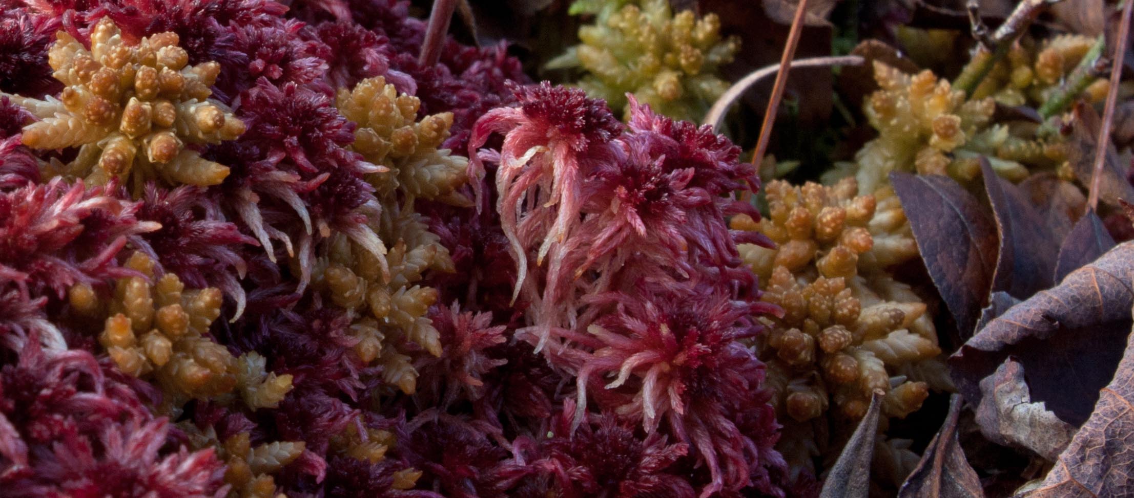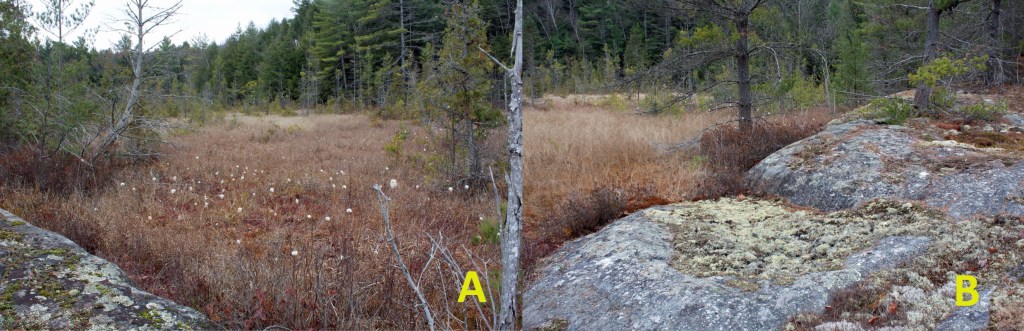 The west-facing incline of Catch Rock was steep, with mostly crustose lichen, and ended abruptly in a flat of brilliant red Sphagnum magellanicum. Bog Haircap Moss (Polytrichum strictum) and Bog Cranberry spread out westward into the marsh-proper.