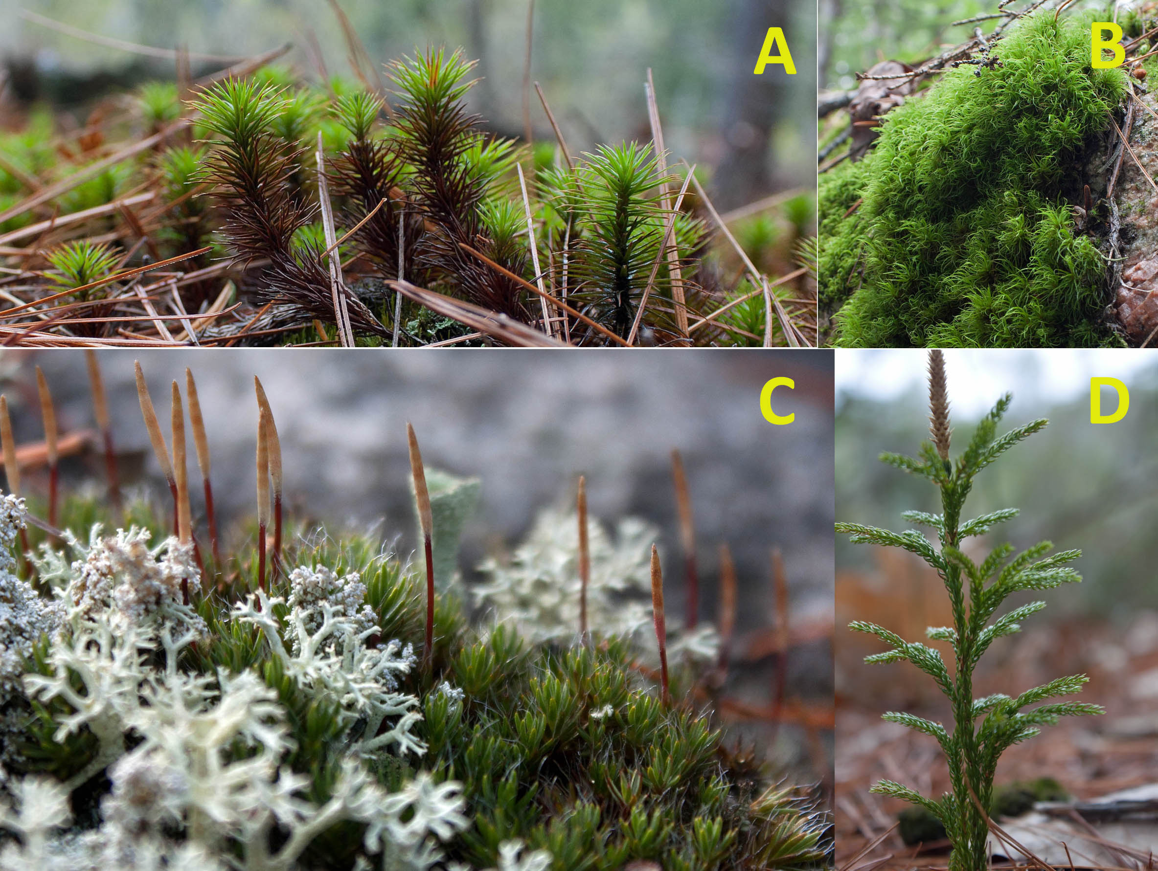 The most abundant moss associated with the lichen on Catch Rock was the Bristly Haircap, Polytrichum piliferum, a bluish-green to gray evergreen perennial moss that forms loose tufts 2-3 cm high with stems becoming wine-reddish with age. The smallest of the haircap mosses, Polytrichum pilifrum commonly grows on open dry and acidic sites low in nutrients, such as shallow soil over outcrops, rocks and boulders. It is extremely tolerant of long periods of dryness and high temperatures in its open sunny habitat. The Bristly Haircap’s distinguishing feature, and the one that gives it its common name, is the long, white hyaline awn at the tips of its leaves, which also give this moss its grey colour. P. piliferum is known to associate with species of Cladonia. P. piliferum is dioecious, having male and female plants; males use a splash-cup to disperse sperm from their antheridia and females have archegonia to which the sperm swim to. Their acrocarp capsules that bear the sporophyte sit on bright red shoots (see previous image labelled C.).