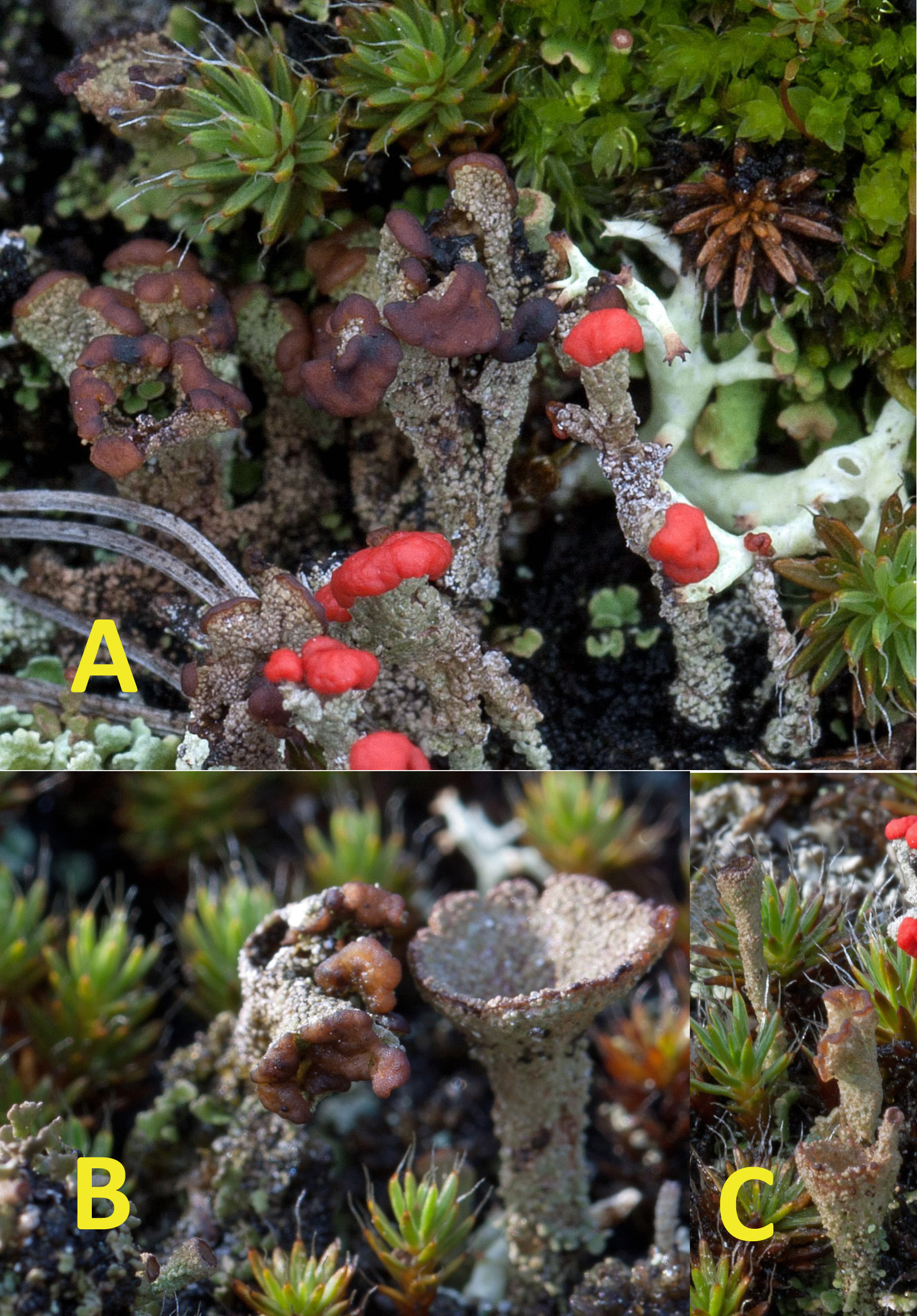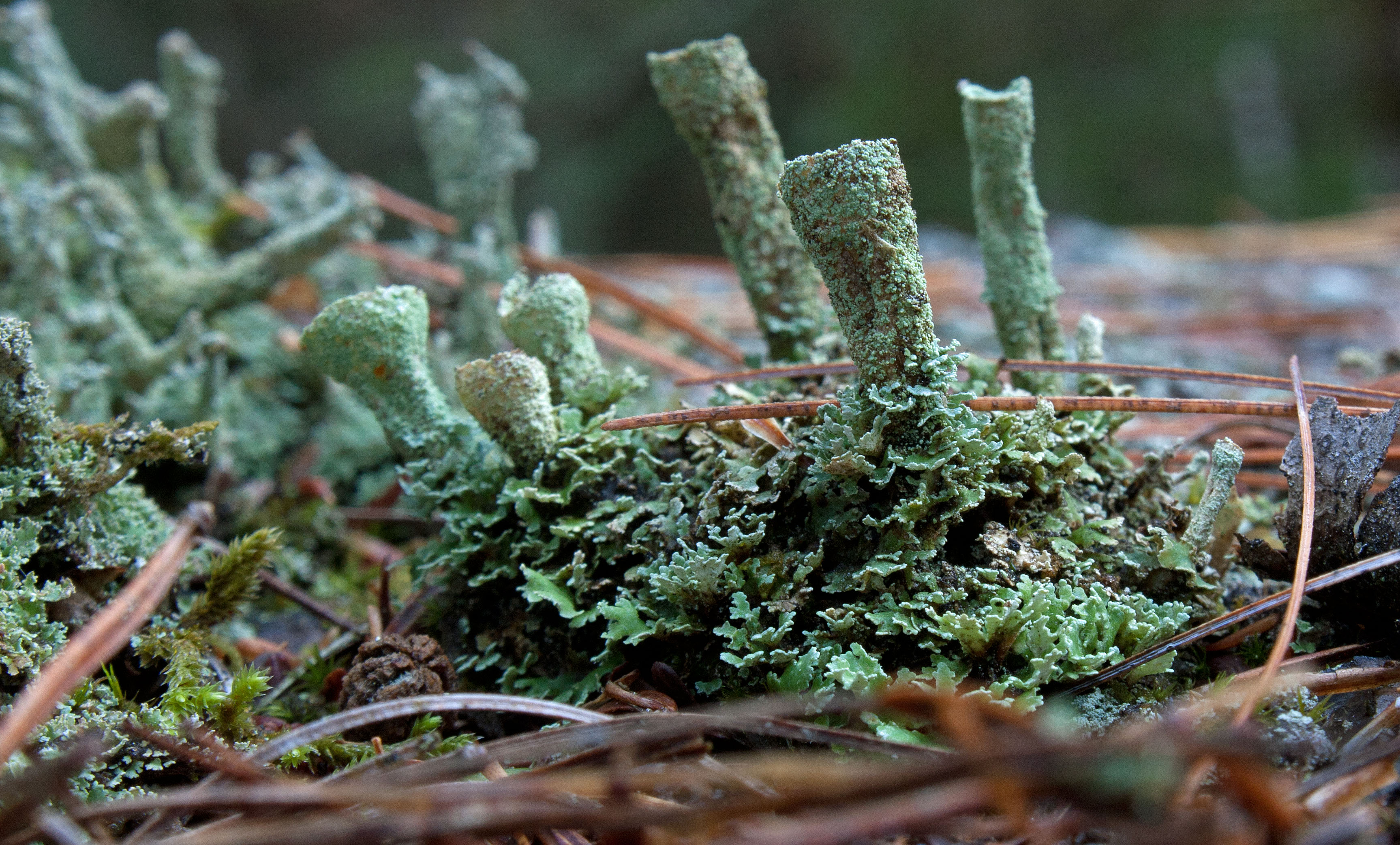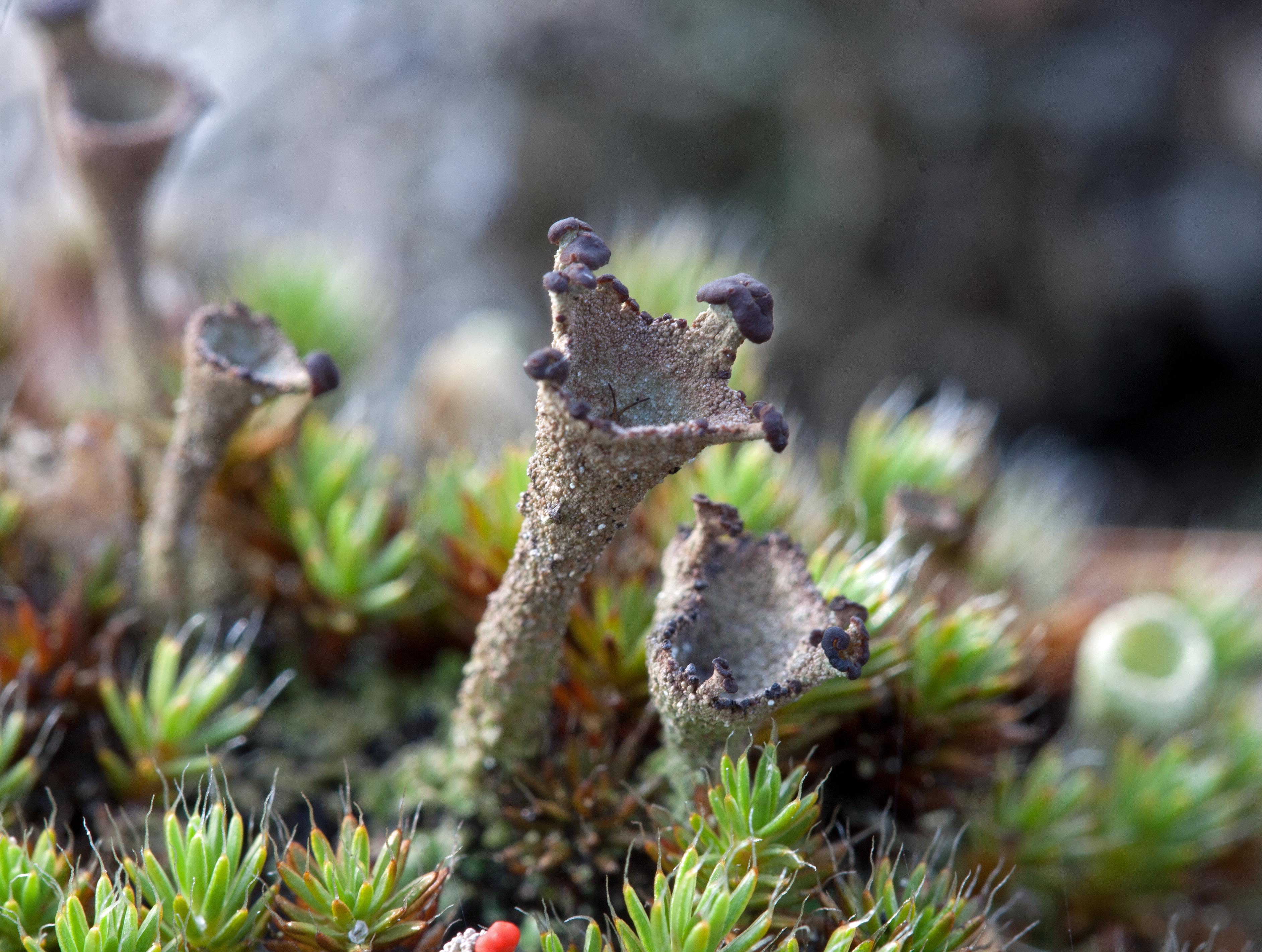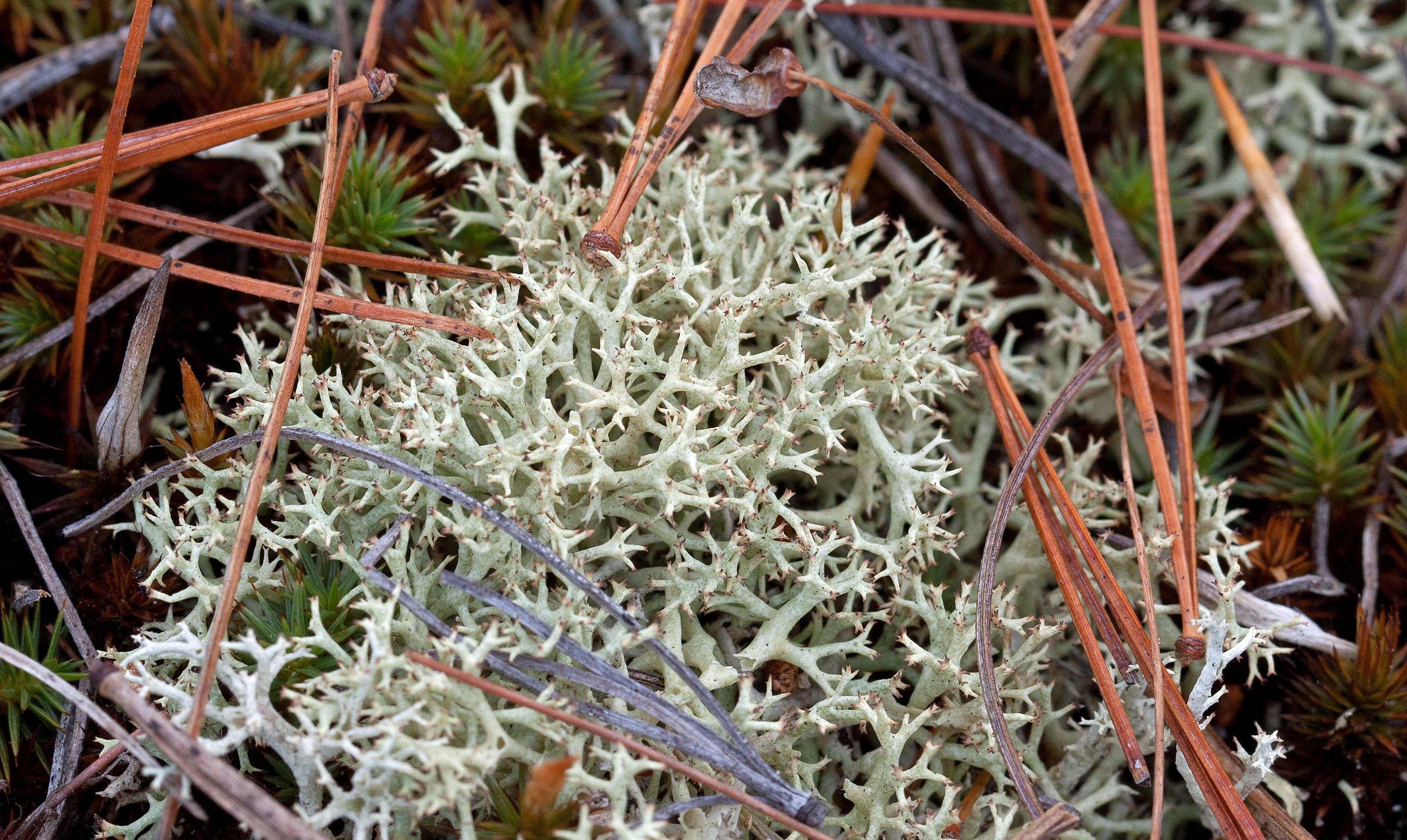 Cladoniarium went on to suggest that secondary metabolites produced by Cladonia (including atranorin, zeorin, and fumarprotocetraric, homosekikaic, rangiformic and usnic acids) are significant for environmental adaptations. Farkas and colleagues showed that usnic acid enhanced ‘canopy’ cover while atranorin decreased the thickness of Cladonia canopy cover. They argued that usnic acid was used in exposed sites to reduce potentially destructive light intensity while atranorin helped exploit low light intensities. Using the example of three widespread and dominant but also very different Cladonias in size, morphology and reproductive strategy (Cladonia cariosa, Cladonia rei, and Cladonia rangiformis), Cladoniarium suggested that in fact their shared secondary metabolites were the key to their shared success.