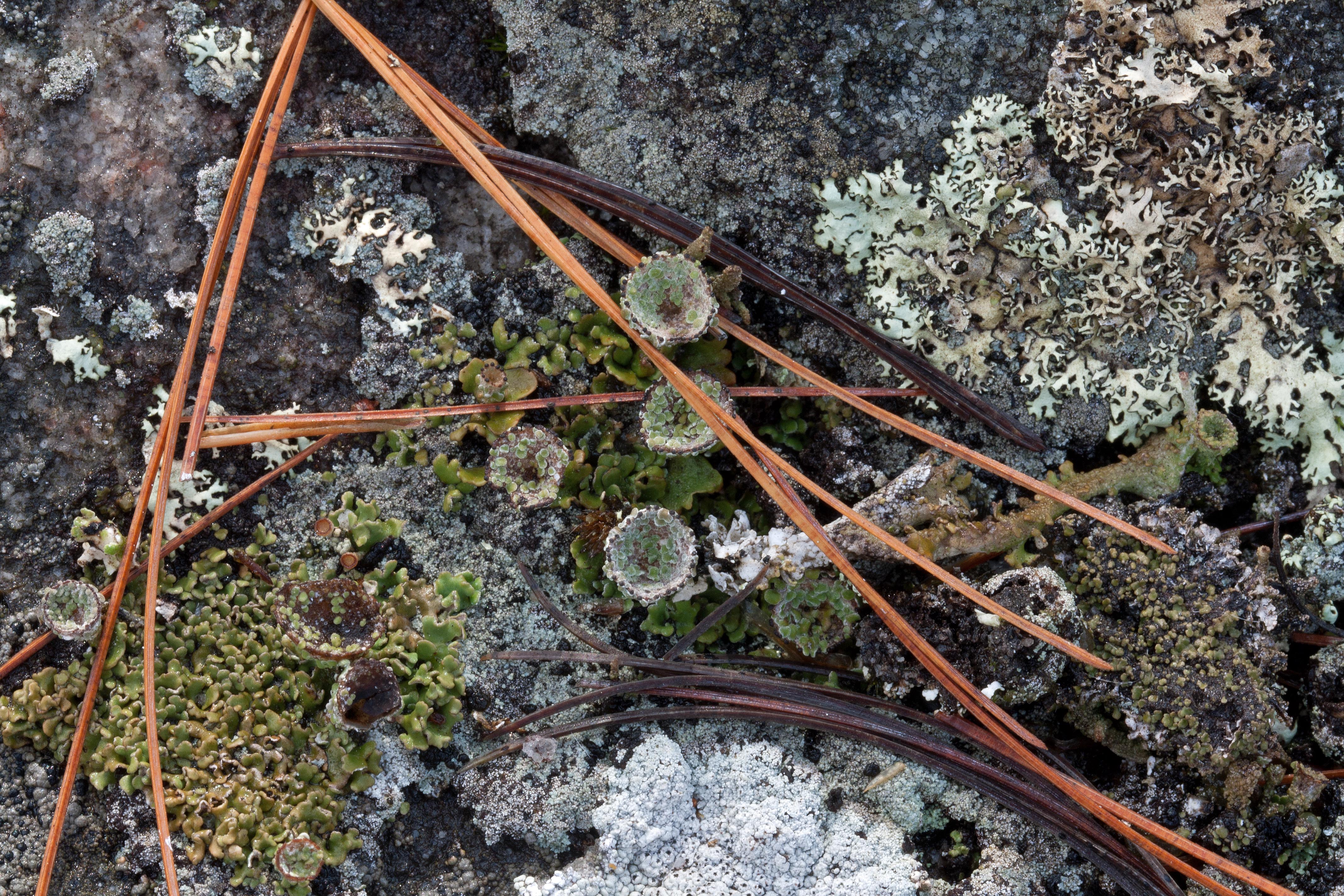 Chewing Gum Lichen or Stonewall Rim Lichen (Lecanora muralis): I found this beautiful rosette-forming lichen, with lecanorine apothecia and tan disks, spreading over the exposed top surface of the granite outcrop in loose rosettes with leafy-like lobes. This cosmopolitan lichen grows on a variety or rock types from granite to limestone. When dry, the thallus formed pale green areolate ‘lobes’; when wet, the thalli looked more green with polyphyllous squamules. As the name suggests, this lichen likes granite. Because the squamulose thallus looked foliose to me, I originally identified this lichen as Orange Rock Posy (Rhizoplaca chrysoleuca)—also a granite-loving lichen—but its apothecia were not sufficiently orange, abundant and large.