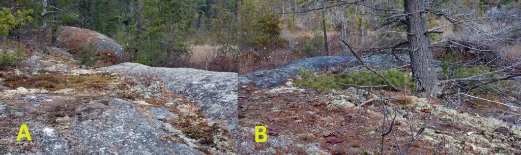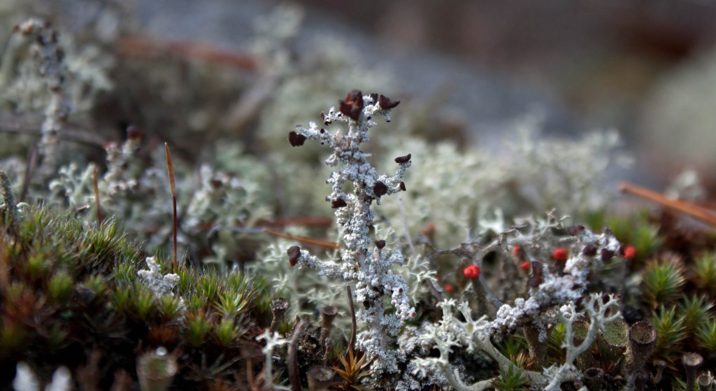 British Soldiers (Cladonia cristatella): this lichen branches at the tips and lacks the cups of the similar Red Fruited Pixie Cup (Cladonia pleurota). I found this lichen in colonies throughout the granitic outcrop, but mostly in hollows of loose soil, humus and detritus-cover. Scientists had identified another branching pixie cup with bright red apothecia, Madame’s Pixie-Cup Lichen (Cladonia coccifera) in the area (though not specifically the rock outcrop). I was unable to distinguish that species from the similar British Soldiers. Madame’s Pixie-Cup Lichen is most often found in open woods in Canada and the upper Great Lakes on acidic peaty and sandy soils.