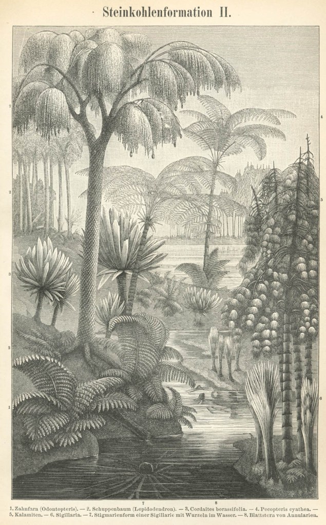 Their evolution and legacy is similar to today’s less than metre-high Equisietidae (horsetail family), whose predecessors were 20-metre high Calamites of the coal forest. Imagine these prehistoric swamps, buzzing with giant insects, and dense with algae, filter-feeders, and amphibian-like tetrapods. Out of these murky lowland swamps emerged forests of bizarre trees such as giant club mosses (arborescent lycopsids such as Sigillaria and 50-metre high Lepidodendron); tree ferns (Psaronius), seed ferns (Medullosa) that looked like palm trees with seeds as large as avocados; and giant tree horsetails (Calamites).