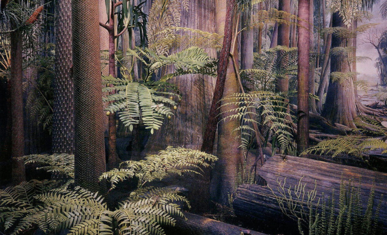 By the end of the Pennsylvanian, club mosses Lepidodendron and Sigillaria declined and became extinct by the end of the Permian Period around 252 million years ago. After millions of years of heat and pressure, the buried remains of club mosses and other giant plants of its ecosystem, were transformed into coal reserves. The anoxic conditions of the swampy environment and the lack of microorganisms to break down the plants (they hadn’t evolved yet!) prevented the plant material from decaying; instead, the dead plant material formed peat (as in our current bogs and fens), which held in the carbon they had taken in. Given the lack of a decay process, no carbon was released and instead this energy was locked in the coal forest for millions of years. Yielding to heat and pressure and sedimentation events from inundating seas, the forest peat biomass transformed to coal and this was ultimately released through mining by humans millions of years later.