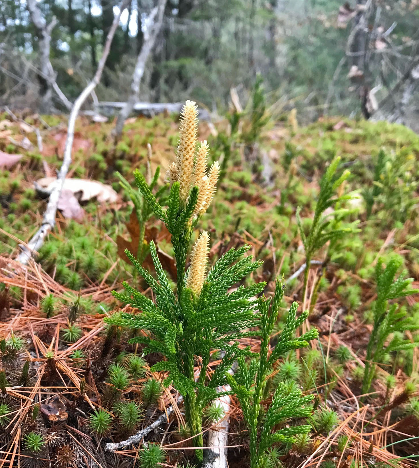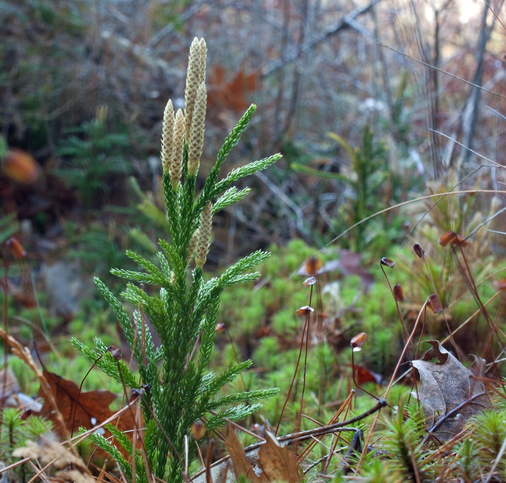 Club mosses are, in fact, not mosses at all. They belong to a seedless vascular plant family Lycopodiaaceae, closely related to ferns. And, like ferns, club mosses reproduce by releasing a large amount of tiny spores—usually from club-shaped structures like the strobili I found on both specimens I saw. Long-lived evergreen plants that resemble miniature conifer trees are native to moist woodland habitats in North America.
