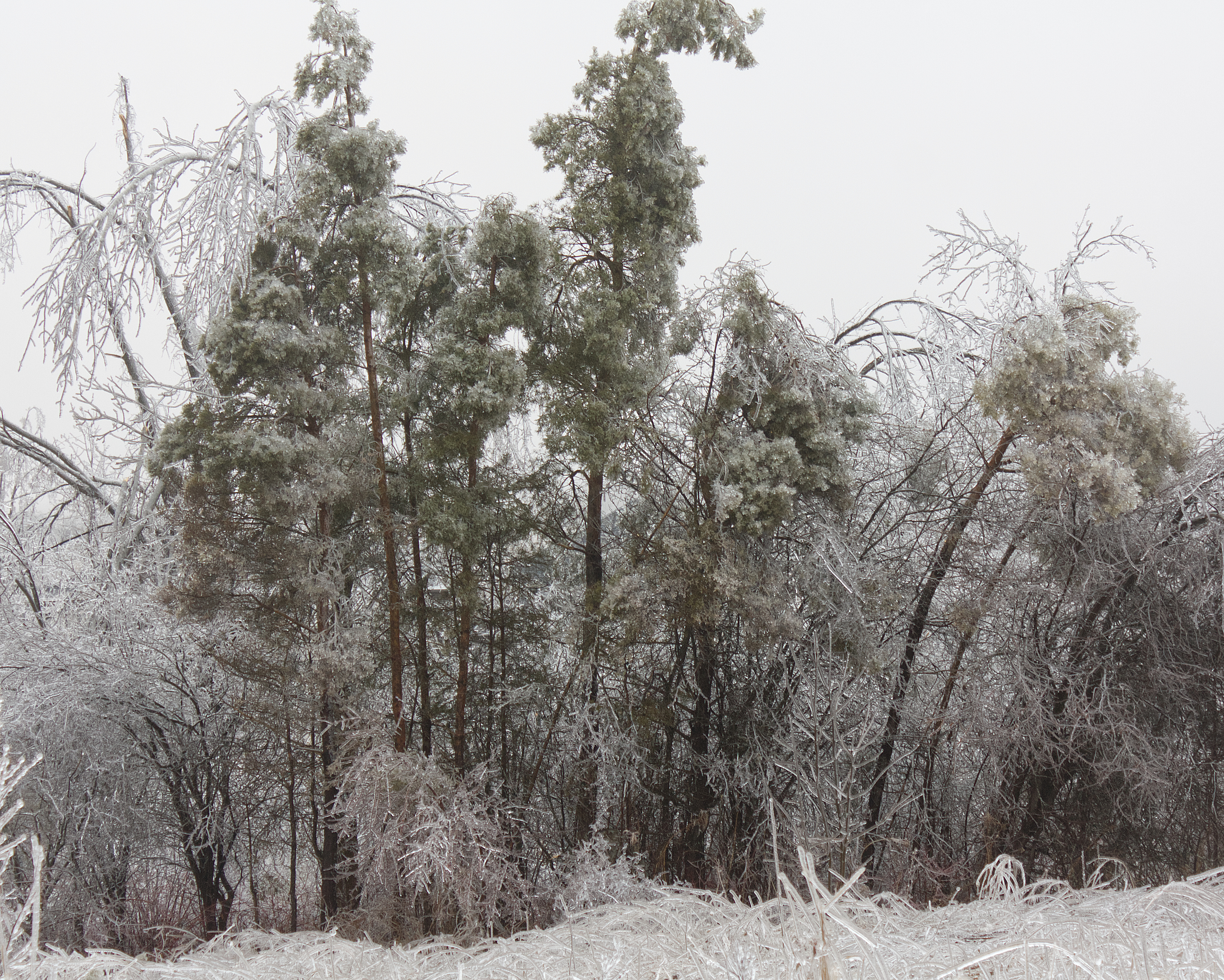 Oddly, but not surprisingly, the draping conifer trees–the firs, spruces, pines and cedars–seemed to weather the ice storm with fewer branches breaking. Part of their success over their deciduous cousins most likely lies in their morphology, how their branches drape as opposed to the heaven-ward reaching branches of maples and oaks.