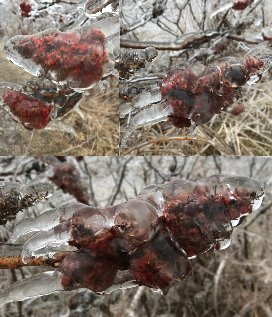 I kicked one ice-covered shrub, a red osier dogwood whose bright red branches had bowed to touch the ground as if in prayer; my thought was to break off the ice and free the branches. It worked, most of the time. In one case the whole branch snapped off to my violence, brittle like the ice encasing it. I thought better, thinking Nature would take care of itself without my clumsy interventions.