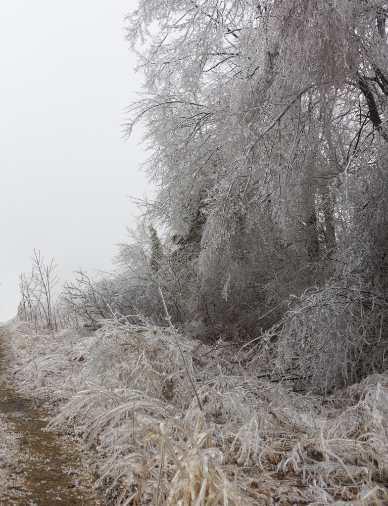 I picked my way around the tree debris and bowing limbs over the sidewalk toward an easement meadow surrounded by mixed forest. I was looking for adventure amid the booming and cracking of tree limbs and the moody sibilance of freezing rain.