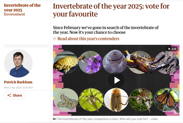 When I discovered that The Guardian was hosting a celebration of The Invertebrate of the Year, I was both fascinated and intrigued. This is their second year of what is becoming an annual vote by Guardian readers. Last year the common earth worm won hands down.