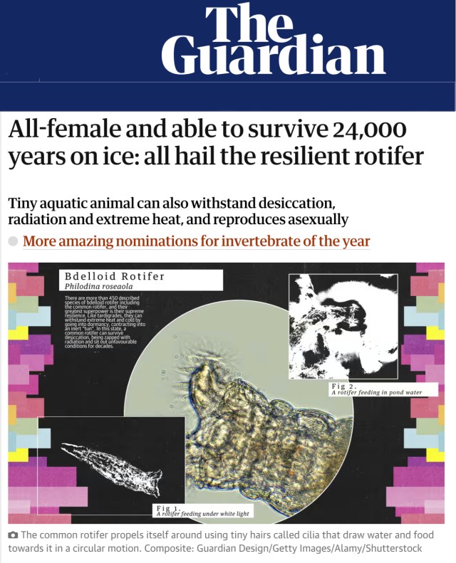 Patrick Barkham wrote: “The Canadian limnologist, science fiction writer and Guardian reader Nina Munteanu makes a brilliant case for the common rotifer in her nomination for invertebrate of the year 2025: ‘Highly variable environments tend to support organisms uniquely equipped for change,’ she says. ‘These are the explorers, misfits, and revolutionaries who do their work to usher in a new paradigm. They carry change inside them, through phenotypic plasticity, physiological stress response mechanisms, and life history adaptations.’ ”