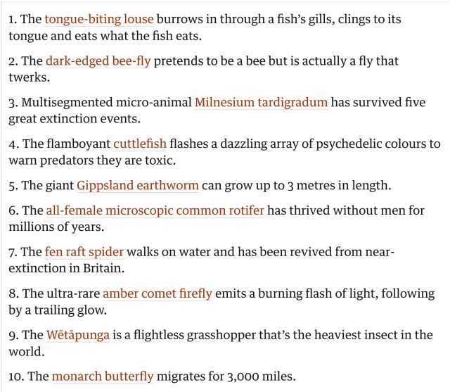 “Invertebrates don’t get the attention lavished on cute pets or apex predators,” said Barkham. “But these unsung heroes are some of the most impressive and resilient creatures on the planet. So when the Guardian opened its poll to find the world’s finest invertebrate, readers got in touch in droves. A dazzling array of nominations have flown in for insects, arachnids, snails, crustaceans, corals and many more obscure creatures.”