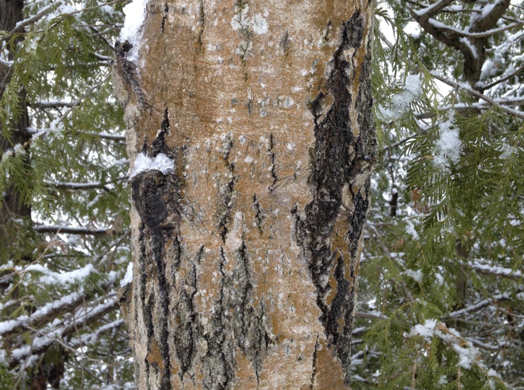 I was walking through the swamp forest of maple, beech and cedar when I entered a meadow sparsely populated with ash trees. I had to stop at one of the trees because its bark was red-orange. It was a phenomenon! What I mean is it was the Red Bark Phenomenon: a species of microscopic green algae (Chlorophyta) with red pigments that mask the photosynthetic chlorophyll. Some smart aleck named this algae the Red Bark Phenomenon. I’d seen it on a poplar tree and a maple tree in the same forest and a hemlock tree in the Catchacoma Forest. At first I thought this red film might be a crustose corticolous lichen. It reminded me of the dust lichens only red, not the typical ice green.