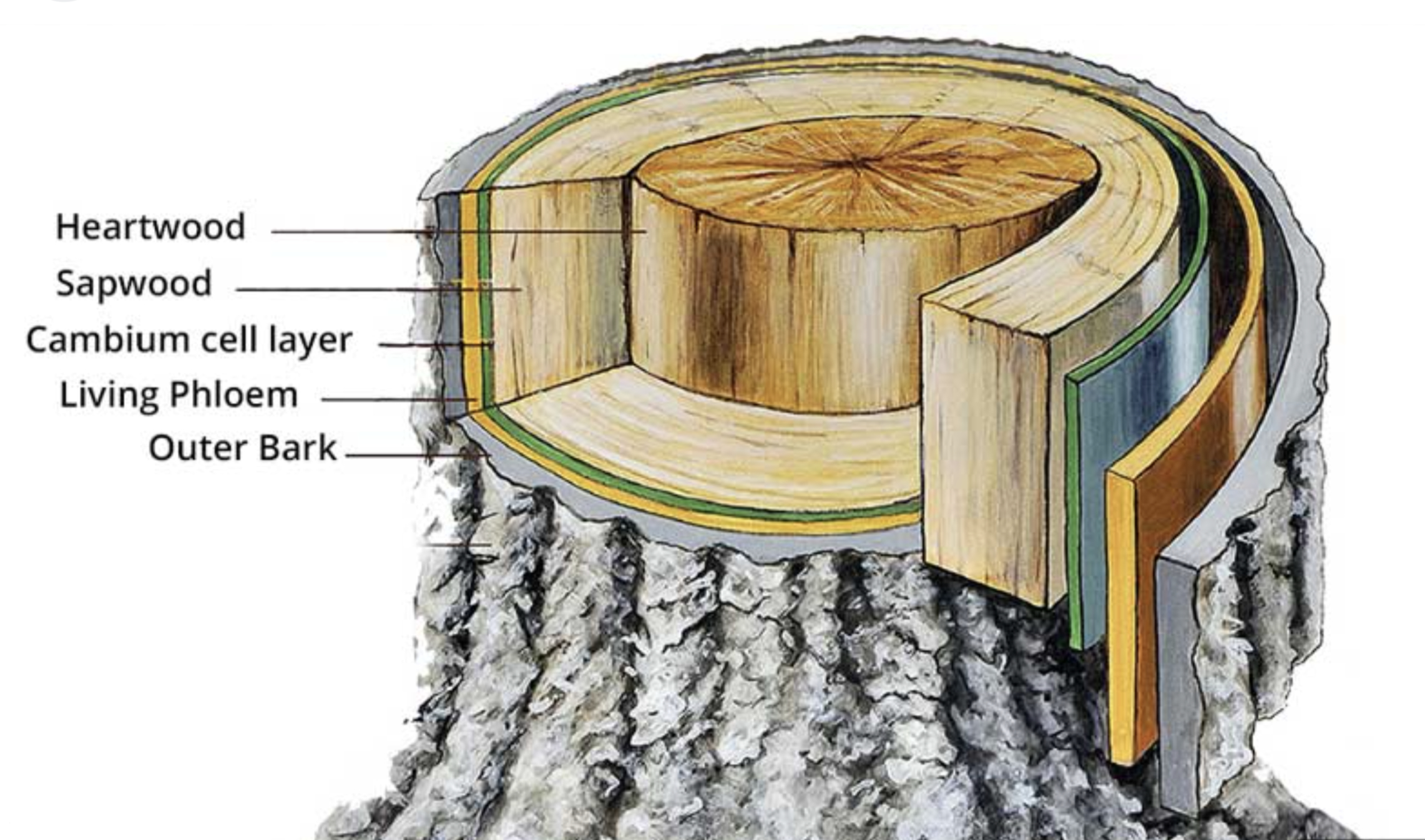 Of course, the sugar maple is known for its delicious maple sap, which flows through the tree’s xylem tissue (sapwood), well beneath the bark. The sapwood is a band of vascular tissue that carries the sap from the roots to the leaves; it exists in a ring just below the vascular cambium layer, the actively growing layer of cells that makes more xylem (sapwood) and more phloem to increase the girth of the tree. Inside the sapwood lies the heartwood, inactive cells that give structure to the tree. The phloem carries sugars manufactured by photosynthesis in the leaves down to the rest of the tree. Outside the phloem lies the periderm, a ring of cork cambium, responsible for making cork that forms the tree’s outer bark for protection.