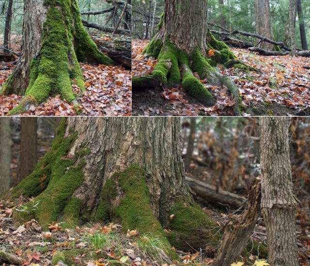 The gnarly bark of these five over 200-year old Sugar Maple trees provided a rich and varied habitat for a diversity of inhabitants. See the table at the end of this article for a list of everything that I found living on each of the five maples: mosses, liverworts, lichens, and fungi. And, of course, signs of invertebrates and animals.
