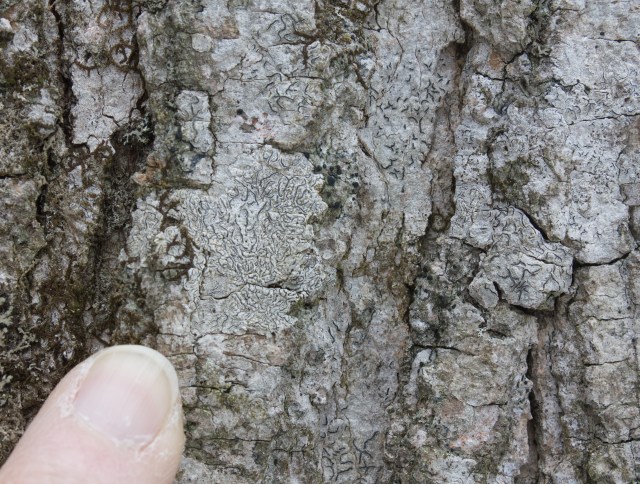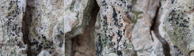 Alyxoria varia is a widely distributed species of corticolous crustose lichen; its ascomata (fruiting bodies) are similar to the apothecia of G. scripta, but simpler (short, often wrinkled oblong, infrequently with simple branches or star-shaped) with a thin evanescent thallus, mostly within the bark itself. Previously called Opegrapha varia, Alyxoria varia prefers the neutral rough bark of old trees in humid but open forests, particularly old maples and other deciduous trees such as elm and oak. I saw many examples of this script lichen hiding in crevices of Maples #1 through #5, with thin to no discernable white thallus.