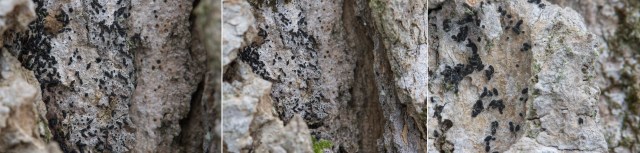 The giant Sugar Maple #4 on the shady upland showed very gnarly bark, which closeup, resembled a dramatic topography of huge cliffs and overhangs over deep chasms that led into dark caverns. All were ‘infested’ with little bean-shaped black-brown things that resembled lips; they turned out to be the naked apothecia of a comma lichen whose thallus was embedded in the bark. I determined that this lichen belonged to the comma lichen of the genus Arthonia. After much searching I landed on Arthonia excipienda, found on deciduous trees in humid forests. A. excipienda also colonized Maple #5, up the hill. I later also found in on Maple #1.