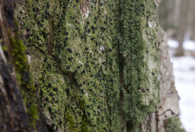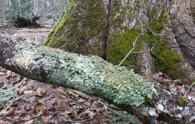 After a severe ice storm tore many upper tree limbs and large maple branches littered the ground, I was able to see what grew higher up these giant maples and confirm vertical stratification of life on the bark of these tall trees.
