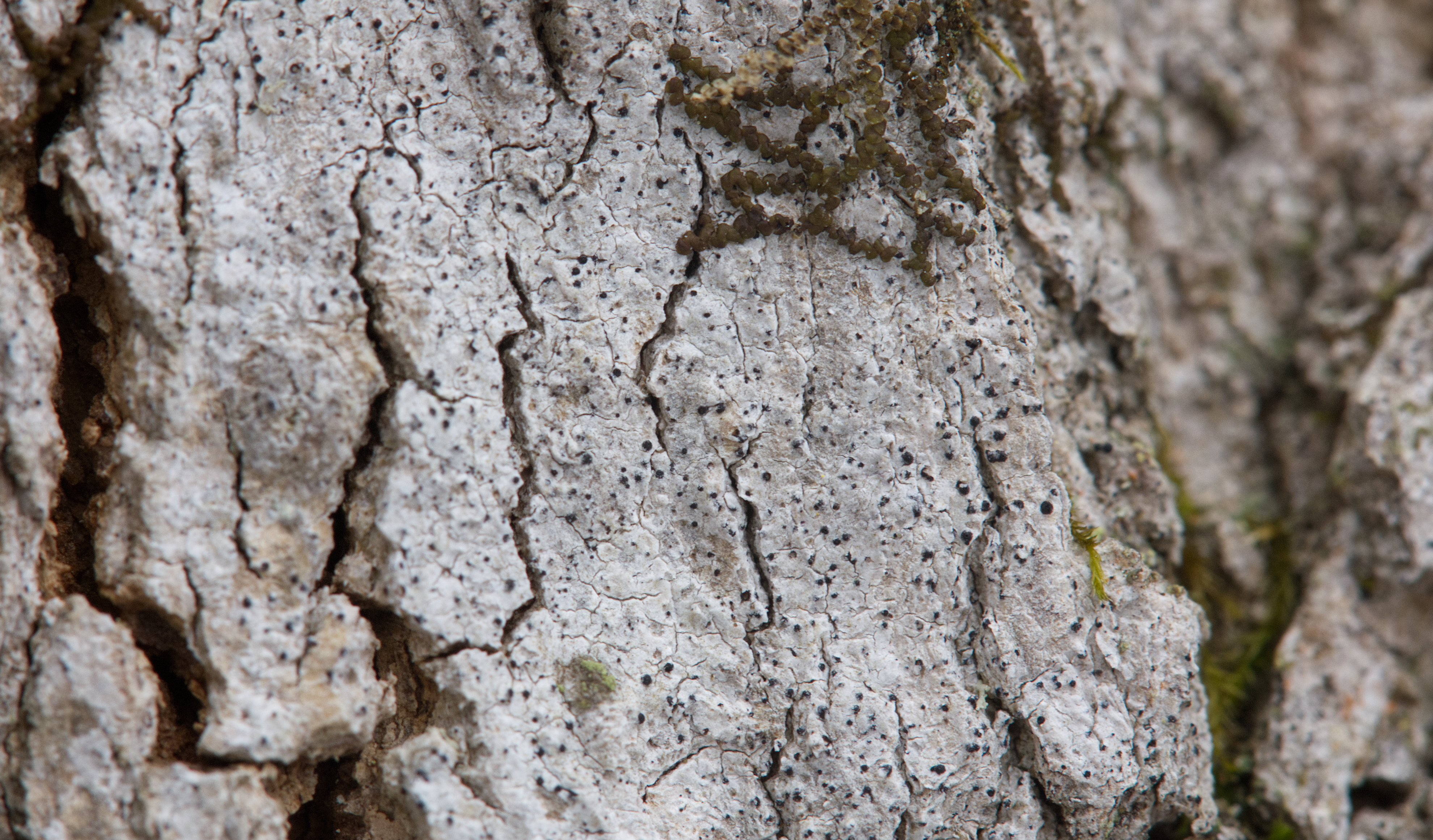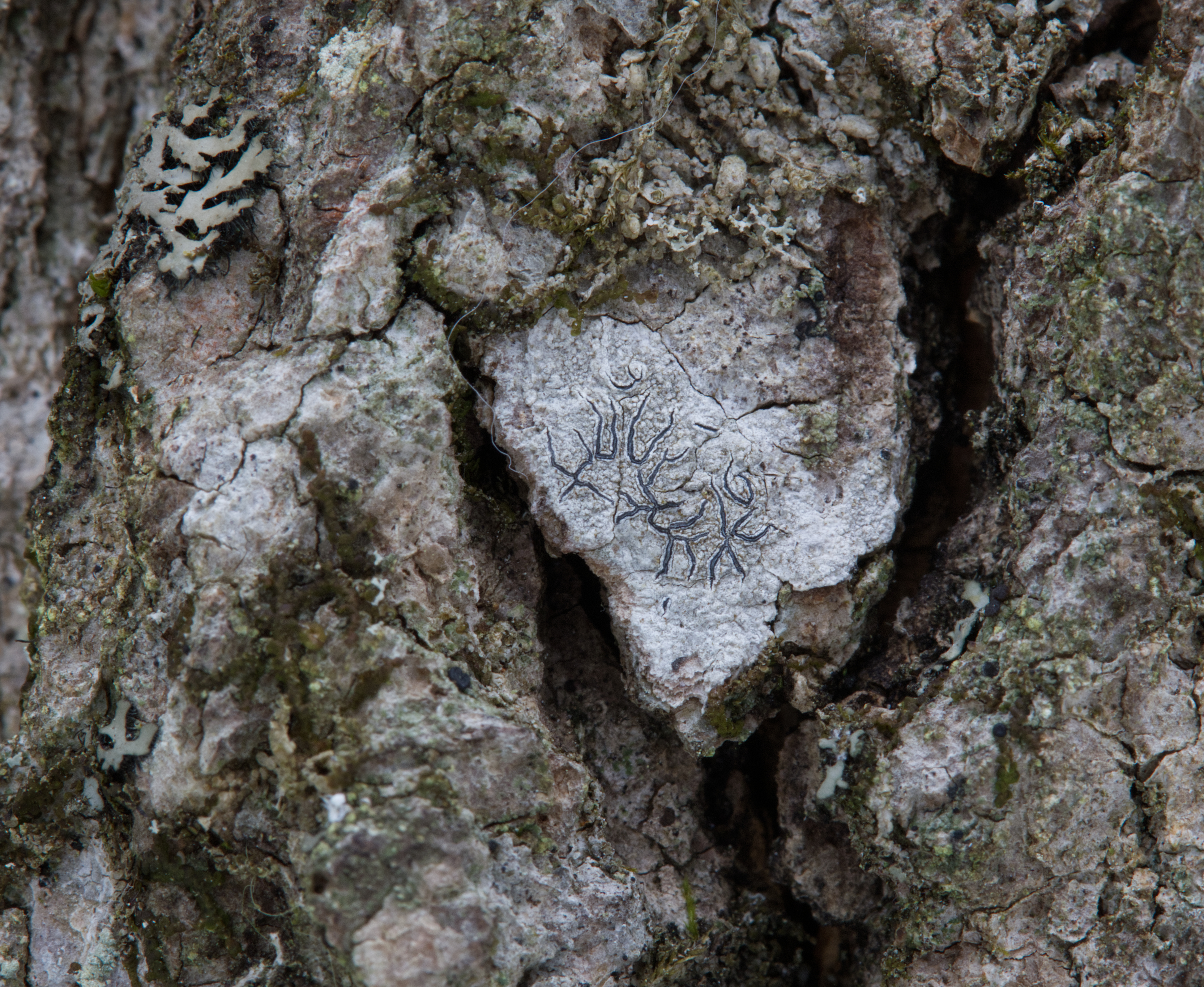 All my studied maples, but particularly Maple #1, were colonized by small white splashes of the Common Script Lichen (Graphis scripta), a crustose lichen with white-grey thallus and blue-black squiggles. Practically every plate of flat bark on Maple #1 displayed a mini parchment with squiggled ‘writing.’ This genus has been writing its memoirs for over 250 million years. Its ‘parchment’ is the grey-green-whitish thallus of the lichen and the scribbled blueish ‘script’ (actually black but pruinose) are the fruiting bodies (aphothecia) of the lichen, whose elongate “lirellae” branch and get pointy at their edges. Several beech trees nearby also hosted this writing lichen. The deep furrows and gnarly plates of these old maples didn’t stop this lichen from writing its poetry though; patches were often restricted to the 1-2 cm surface of the bark’s flat surface.