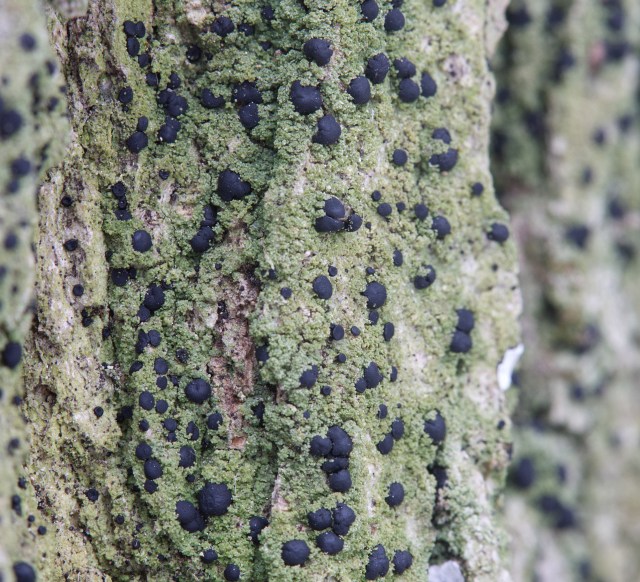 I noticed large patches of a green highly granulated crustose lichen with noticeable blue-black half-spheres at the base of Maple #3 and #4. I then observed small scattered patches on the other Maples. The blue-black fruiting bodies (apothecia) embedded in the granular green thallus start out as flat ‘disks’ then grow into round convex ‘half-spheres.’