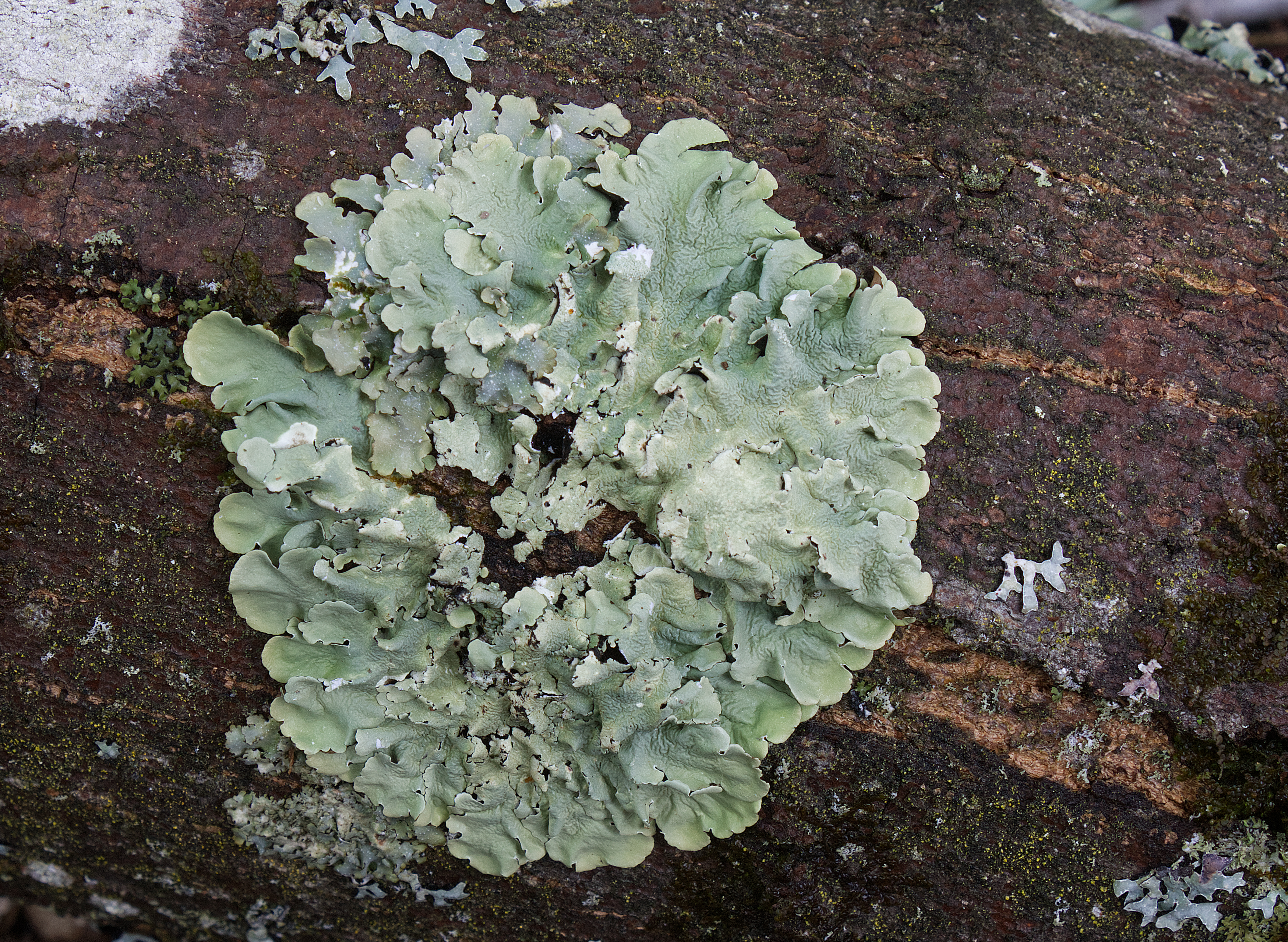 Two large foliose lichens dominated the branches that had fallen from at least twenty metres above the ground. The pale yellow-green corticolous Common Greenshield Lichen (Flavoparmelia caperata) formed fist-sized circular patches that wrapped right around the branch. Known to grow on bark of all kinds in sun or partial shade, this very common lichen is often the first to return following complete loss of lichens.The lobes of most specimens I saw were wrinkled, showing their age. The corticolous Rough Speckled Shield Lichen (Punctelia rudecta) sprawled over and under and alongside the Common Greenshield Lichen, large lobes spreading out from the thallus edges. This bluish-green lichen is distinguished by the tiny white pores (pseudocyphellae) on its upper thallus and central dense mass of white brown-tipped isidia (asexual fruiting bodies). Its annual growth rate (5 mm/year) tends to be faster than Common Greenshield Lichen (1-5 mm/yr).