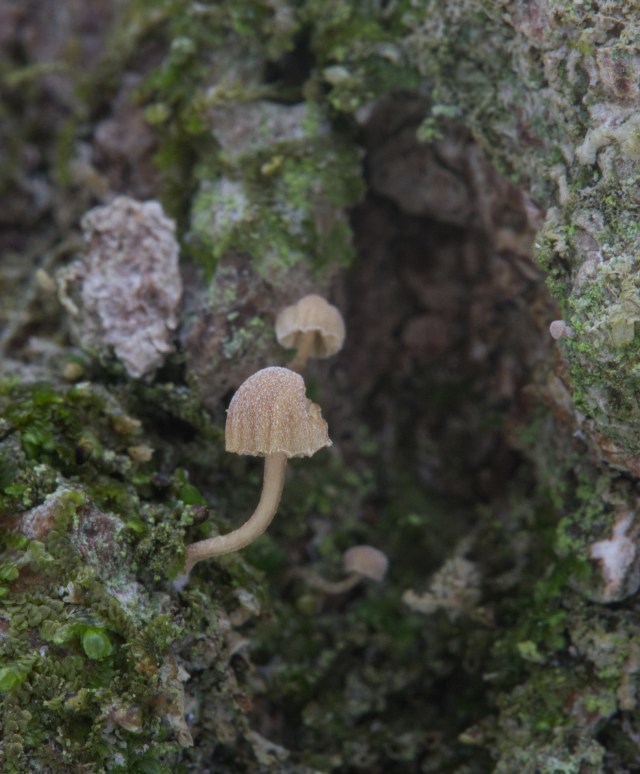 I even found a TLBM (Tiny Little Brown Mushroom) on Maple #2, perched on a bark ledge amid lichen and scaleworts. Called Bark Bonnets (Mycena corticola), these tiny pink-tan saprotrophic fungi are no larger than 5 mm and normally grow on the bark—not the wood—of fallen and standing hardwoods and conifers. The Bark Bonnet belongs to a group of mushrooms, the Mycenoid mushrooms, appropriately called Fairy Helmets.