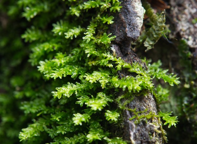 Tree-skirt Moss (Anomodon attenuatus, which also goes by Pseudanomodon attenuatus), forms sprawling mats or low cushions, primarily on tree bases which retain moisture and where it creates a lush green apron or skirt that clings to the bark through an adapted holdfast system. This beautiful and delicate-looking moss thrives in moist, shaded forests and prefers trunks and bases of trees. Moss and Stone Gardens tells us that it can best be found in deciduous forests, but also inhabits the bases of conifers–though, I did not see it on any of the nearby hemlocks.