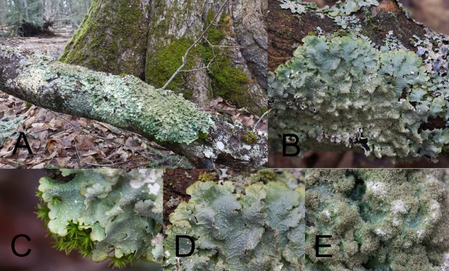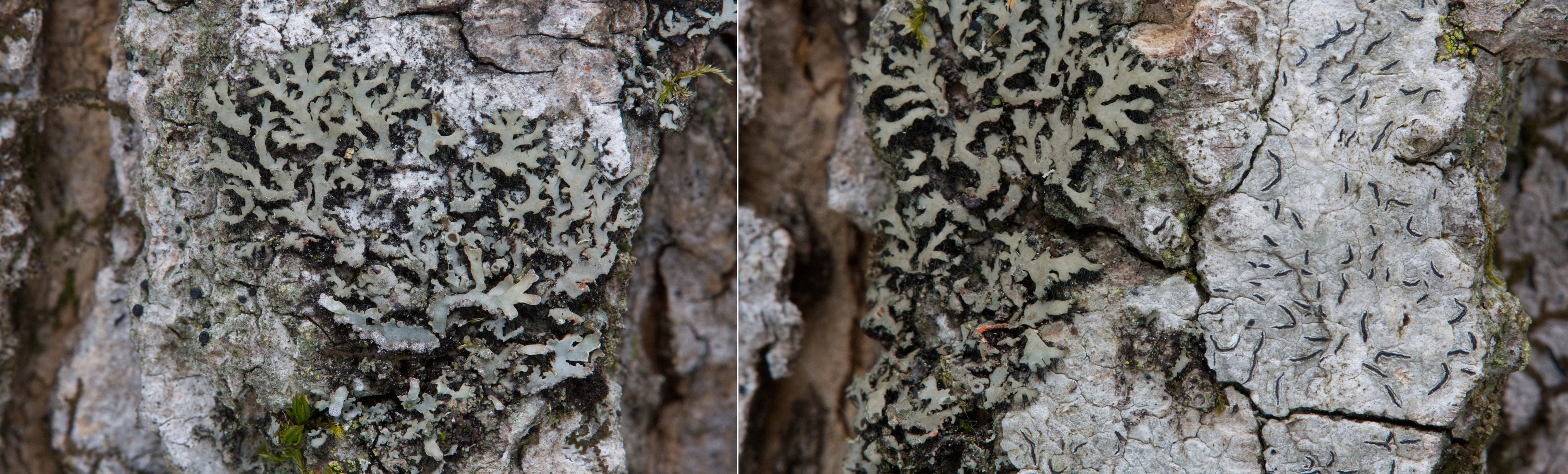 Both lichens prefer hardwood nutrient-rich bark with base-poor substrate (pH 5.5 to 7.0) in moist shaded environments, and both are considered pollution tolerant. The branches also supported Hammered Shield Lichen (Parmelia sulcata), the City Dot Lichen (Scoliciosporum chlorococcum), and two mosses, Bristle Moss (Orthotrichum spp.) and Crisped Pincushion Moss (Ulota crispa).