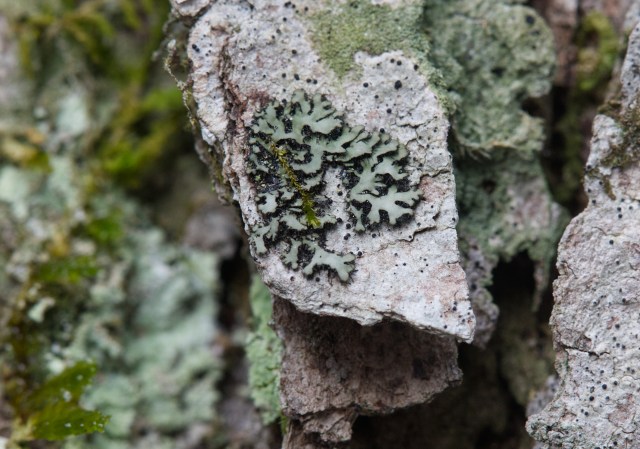 All five maples supported Shadow Lichens throughout the height of bark visible to me. The Pom Pom Shadow Lichen (Phaeophyscia pusilloides) occurred on all five maples. This small foliose greenish-grey lichen is distinguished by its slender lobes and black rhizines that extend visibly out of the thallus on all sides like someone with a bad hair day. It is a common lichen on deciduous trees with nutrient-rich bark, like these old maples; I’ve observed it growing on ash, poplars, maples, beeches, oaks, ironwoods, and birches.