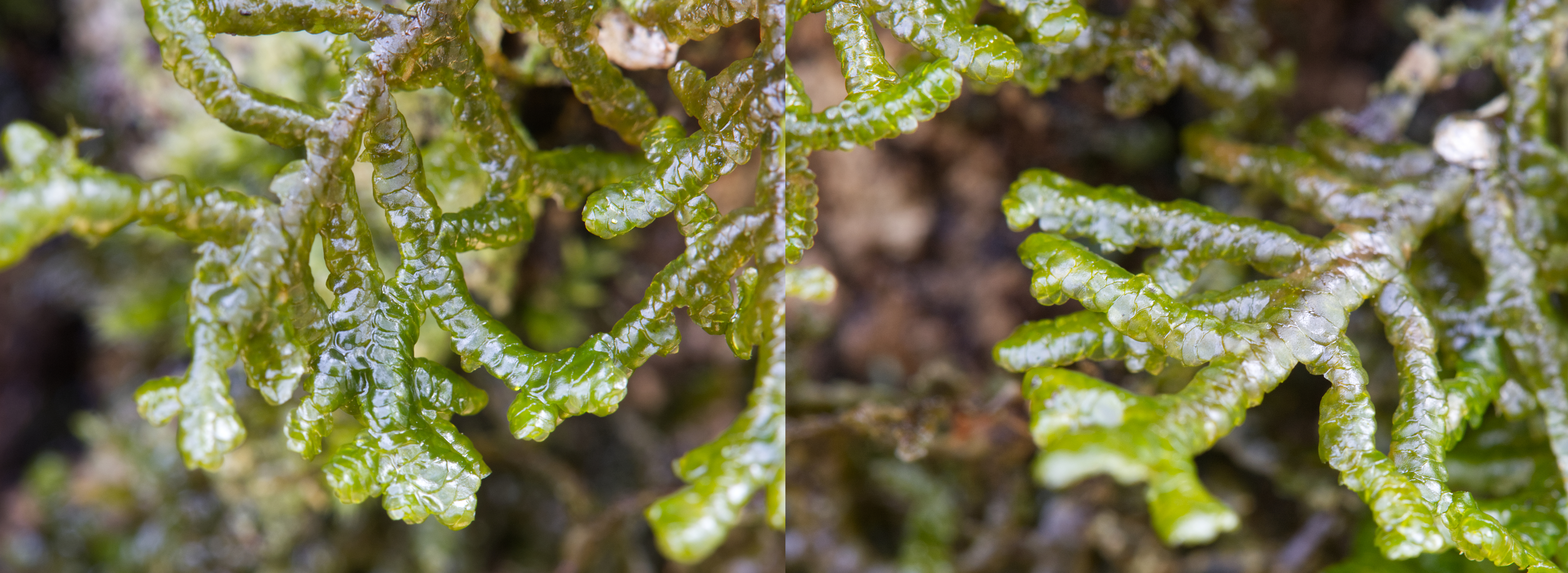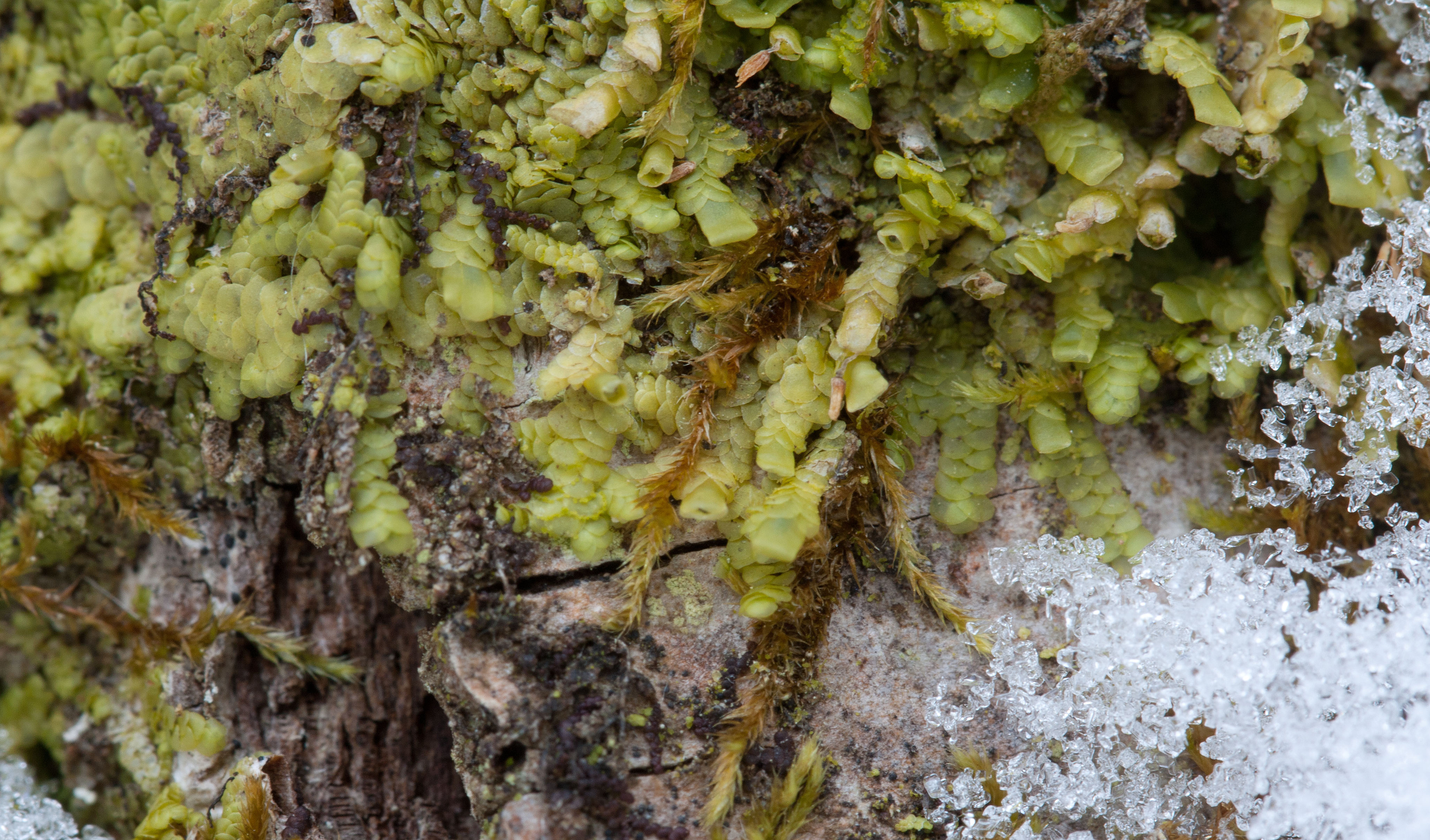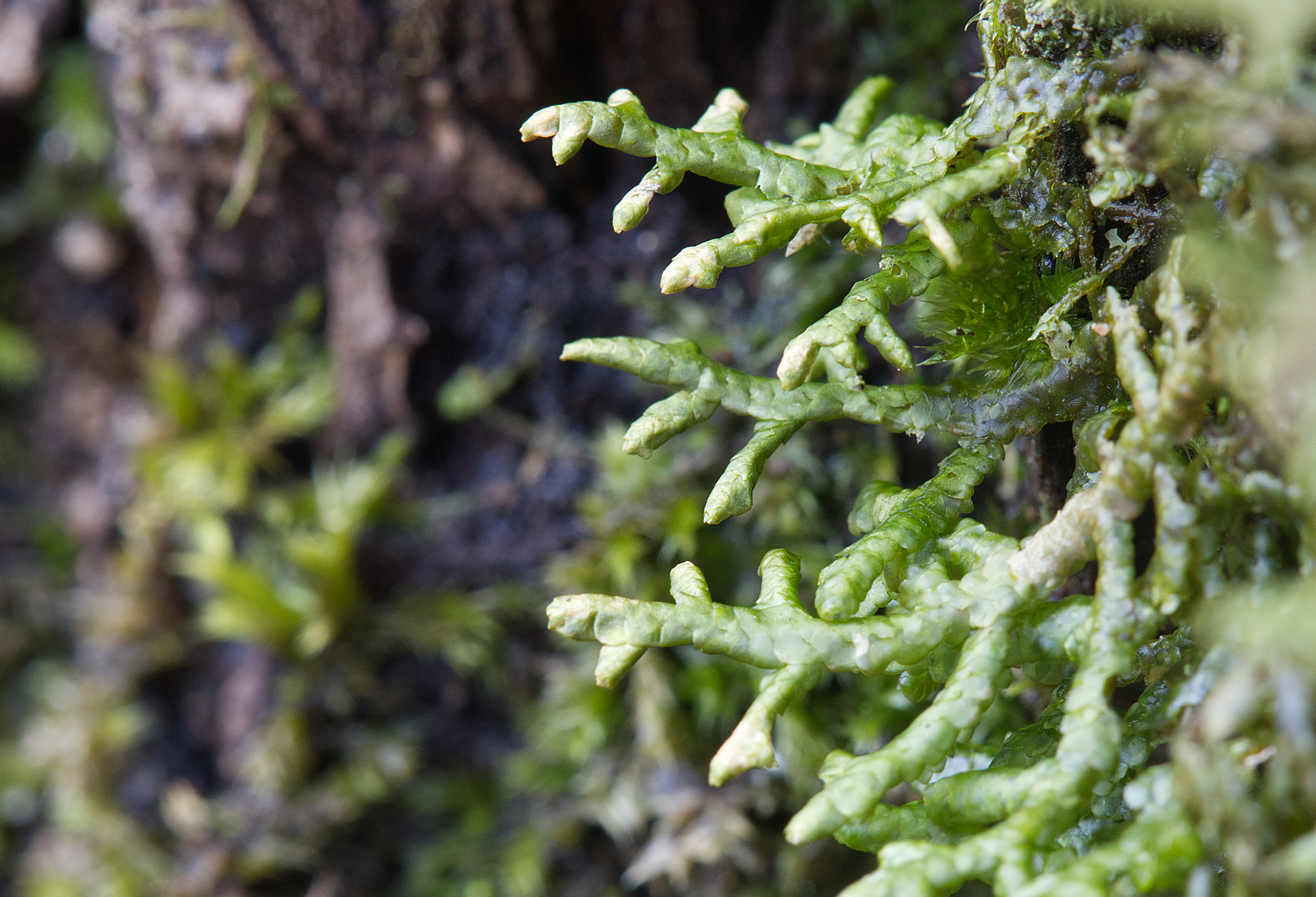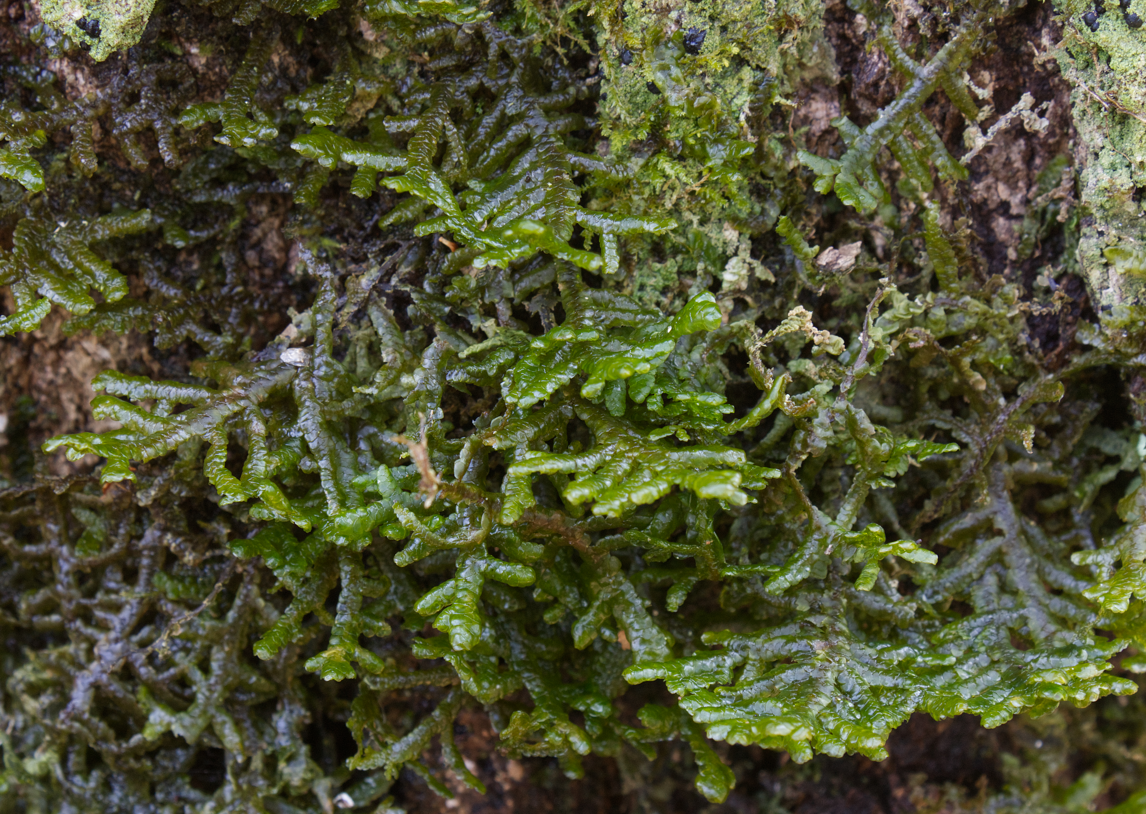 Two liverworts also dominated the tree bases. The first, Tree Ruffle Liverwort (Porella navicularis), I found particularly on the base of Maples #1, #3, and #4. This beautiful liverort formed dense compressed mats of pinnately branching shoots that varied in colour and glossiness, and created ‘ruffles’ that reached out from the tree base.