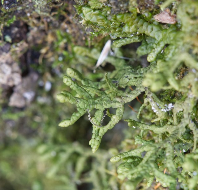 The second liverwort, the Flat-leaved Scalewort (Radula complanata), I found mostly at the tree base but also saw it growing higher up the tree, forming ‘crawling fingers’ along the bark. The Flat leaved Scalewort is bright green with incubous leaves and flat square perianths at the end of the branches. This liverwort usually grows flattened against its substrate (hence the name), either forming patches or with scattered stems that creep among mosses.