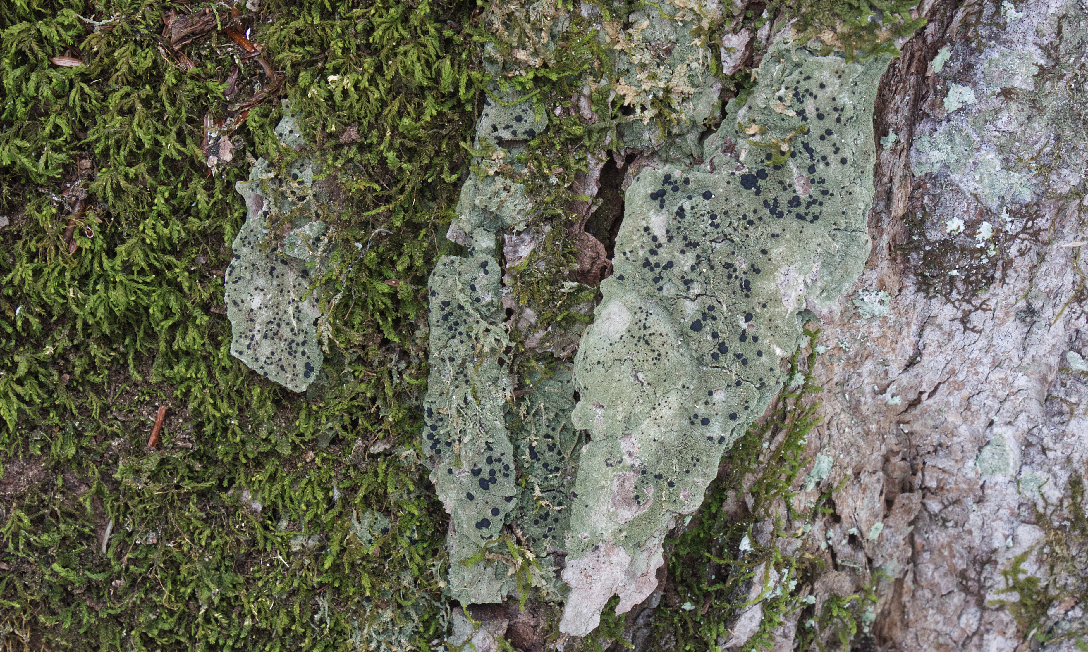 Whitewash Lichen (Phlyctis argena) is a generalist epiphyte, growing on many deciduous trees, particularly on Red Maple, where I’ve seen it colonize large bark surfaces of trunk and branches. The north-facing bark of Maple #4 contained large areas of Phlyctis argena.
