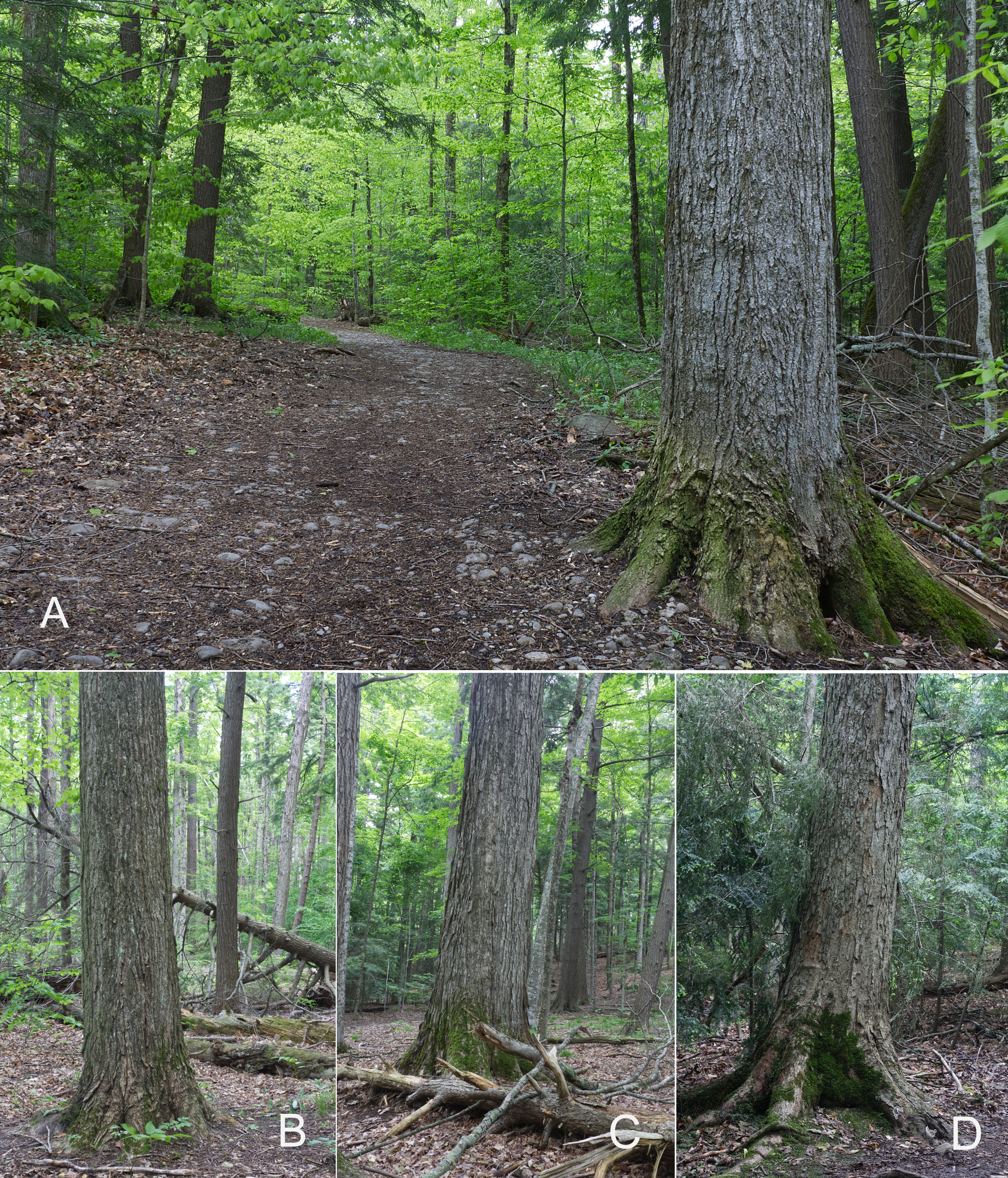 Maple #1 stood slightly upslope in a more open area, next to a young stump and surrounded by young beech trees and hemlocks, about 110 m from the fork in the trails. Maple #2, #3, and #4 were located further down in the lowland swamp forest, under the shade of white cedars and eastern hemlocks. Maple #2 was about 76 m down the low trail from Maple #1, well within the denser older hemlock forest. Maple #3 was another 51 m down the trail in a swamp with large hemlocks and yellow birches and #4 another 8 m northeast toward the drumlin trail. Maple #5 stood perched on the steep western slope of the drumlin, among giant hemlocks and surrounded by a few beeches and some American Hop-hornbeam and ash trees.