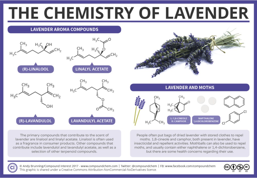 I’m told that lavender’s aroma comes mainly from linalool and linalyl acetate, both part of the terpene family. Linalool, which helps repel mosquitos, is widely used in fragrances as well as many personal care products and aromatherapies. This terpene also found in mint, cinnamon, coriander, and citrus fruits; it is the chief chemical responsible for the recognizable spicy floral smell of marijuana (the skunky smell of cannabis is from another terpene, myrcene). Linalool is of course known for its calming and soothing effects. It reduces stress and anxiety, helps relax the body and enhance sleep quality, and helps provide relief from pain and inflammation. Two other terpenes, 1,8-cineole and camphor add some hint of scent as well as having insecticidal and repellent properities (such as repelling moths). These terpenes are also found in rosemary, hence the hint of rosemary scent in lavender. I’m told that over 300 compounds exist in lavender’s essential oil, though not all contribute to aroma. Two enantiomers of linalool include the enantiomer licareol, responsible for the scent of lavender, and the enantiomer coriandrol, also found in coriander seed oils and sweet orange flowers.