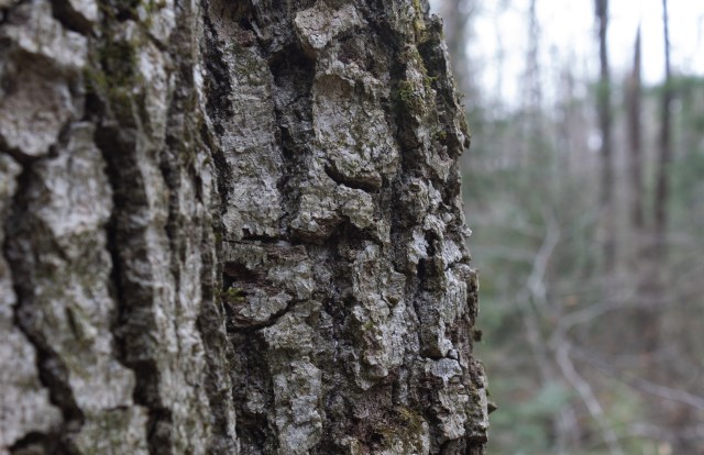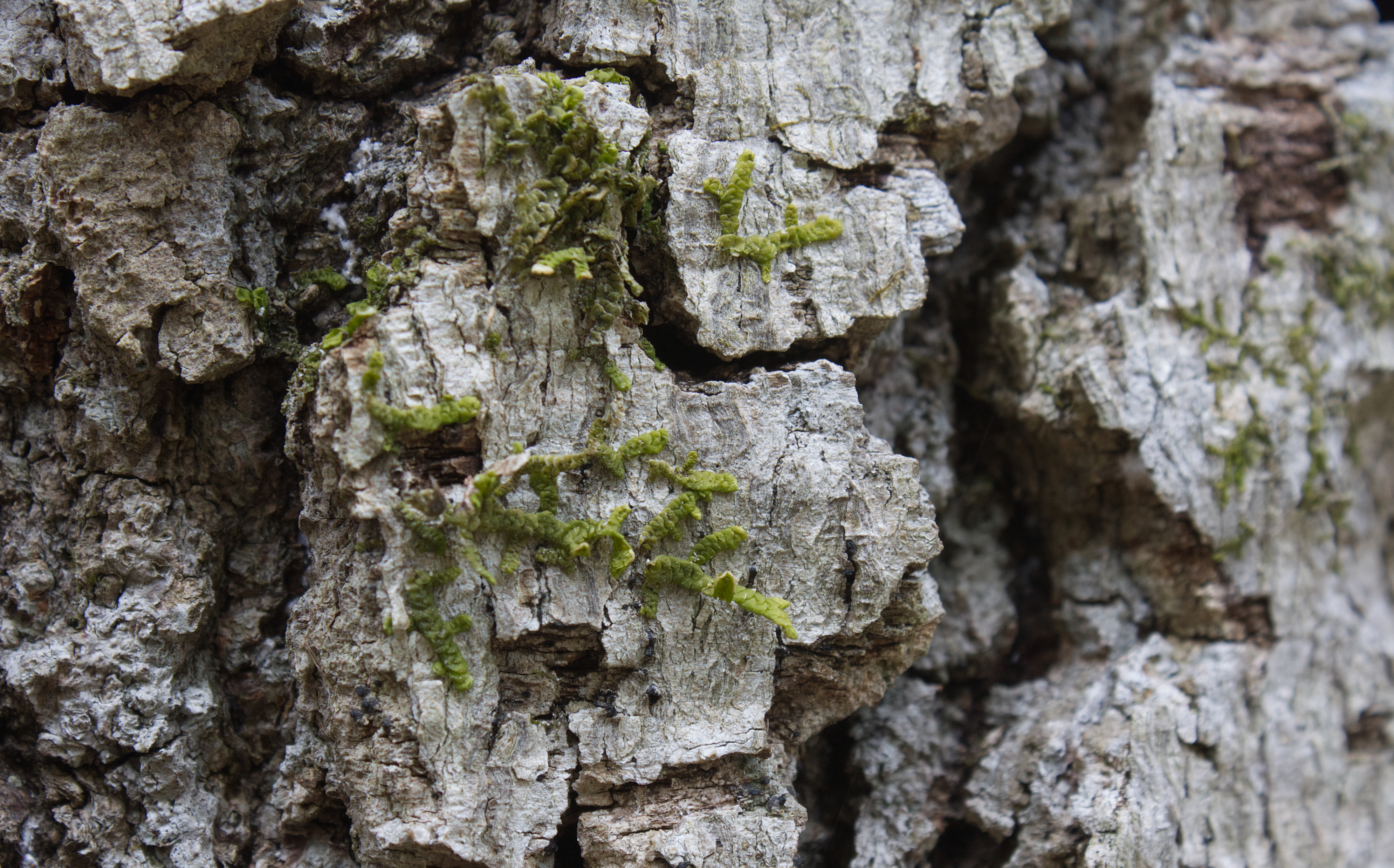 Apart from its thickly-covered base, the heavily scaled and cracking bark of the main trunk had much less growth on its highly ridged and rough trunk than the smoother 150-year old beech. The bark was deeply furrowed with crevices and a general roughness resembling sand paper. It seemed to be peeling layer upon layer. Large pits where the bark had been eaten into the deeper cork layer made significant craters, creating a strange brittle moonscape.