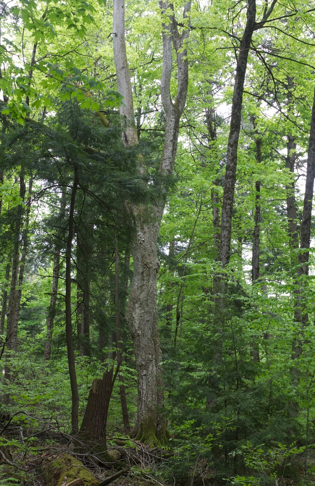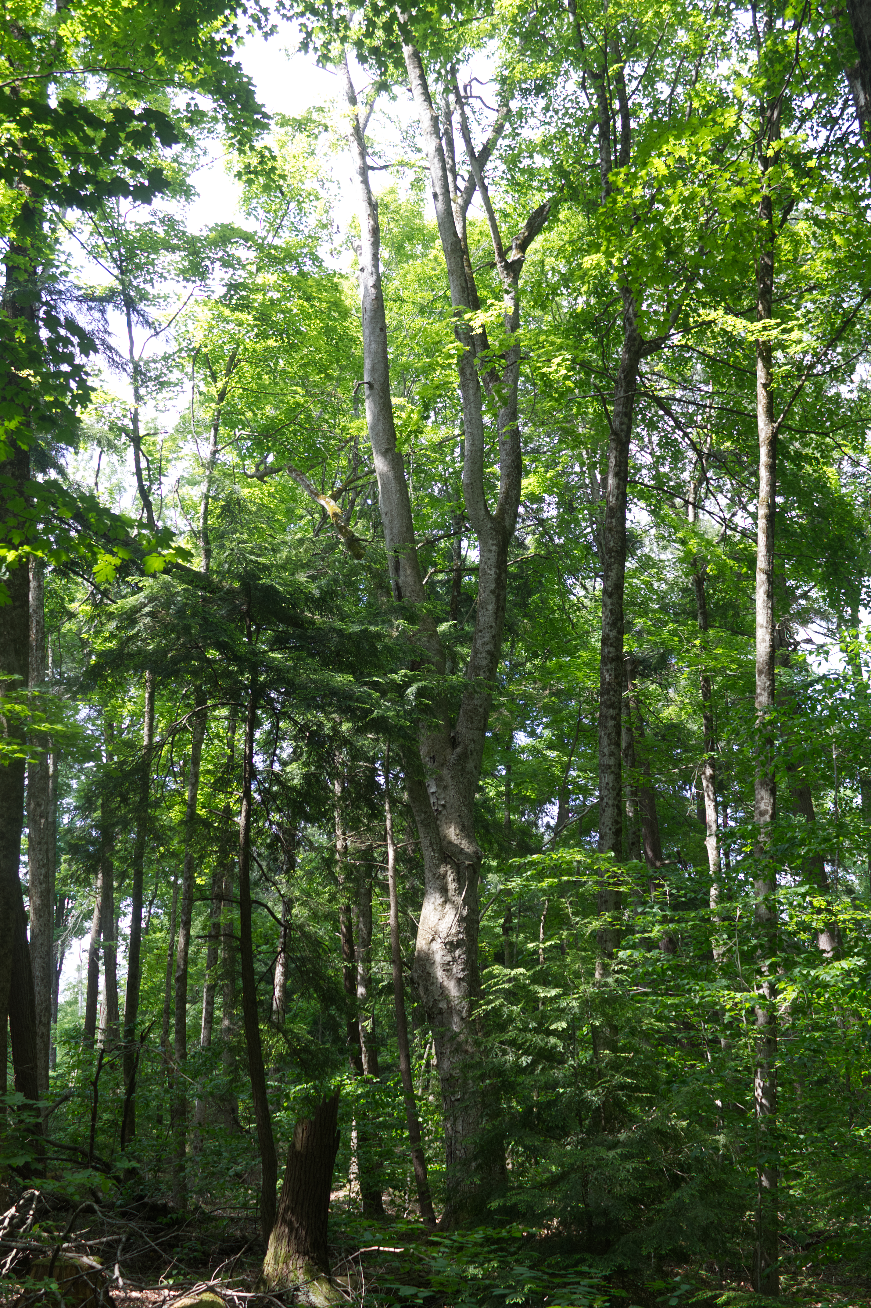 300-year old beech grows tall among hemlocks in Mark S. Burnham Forest, ON (photo by Nina Munteanu)