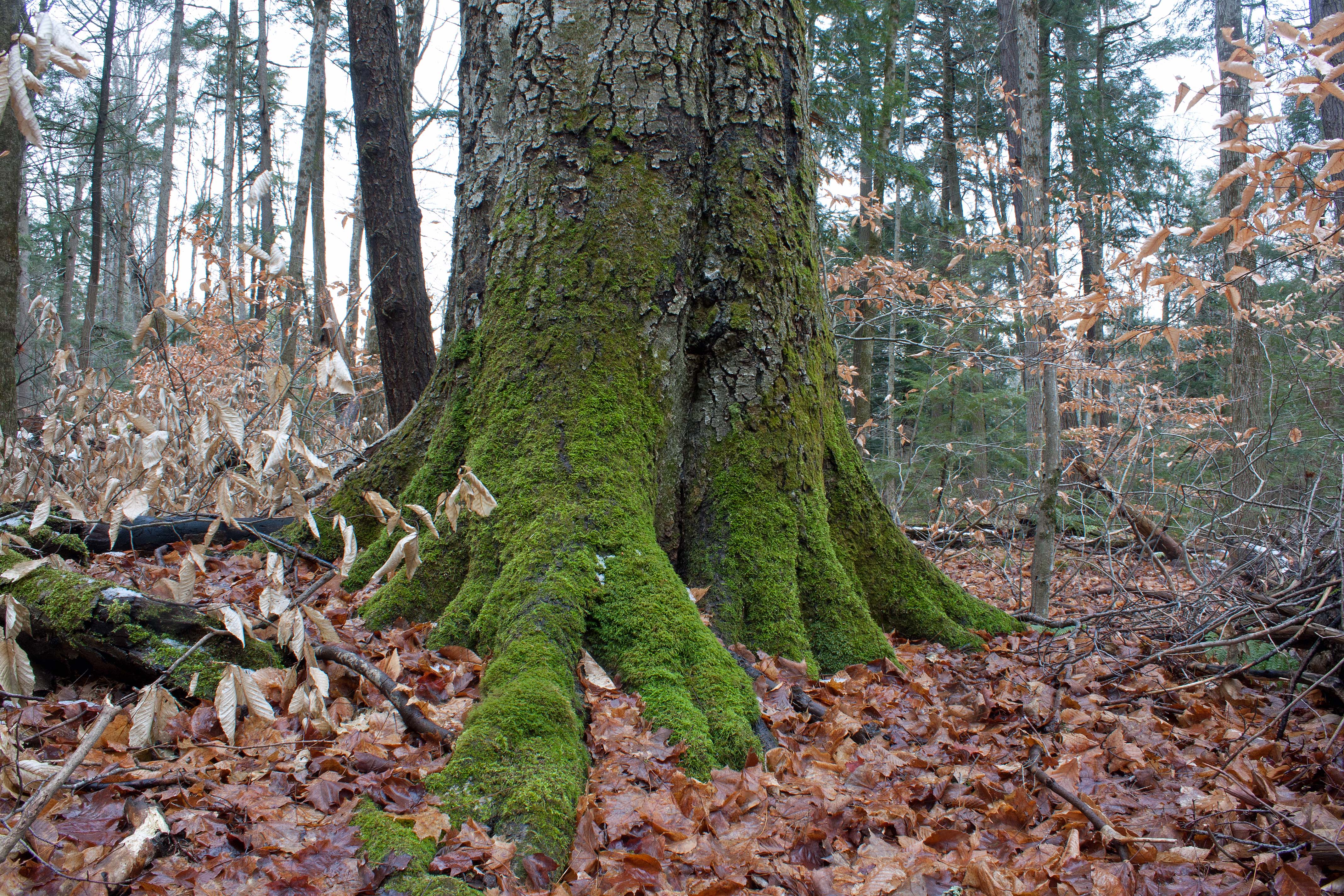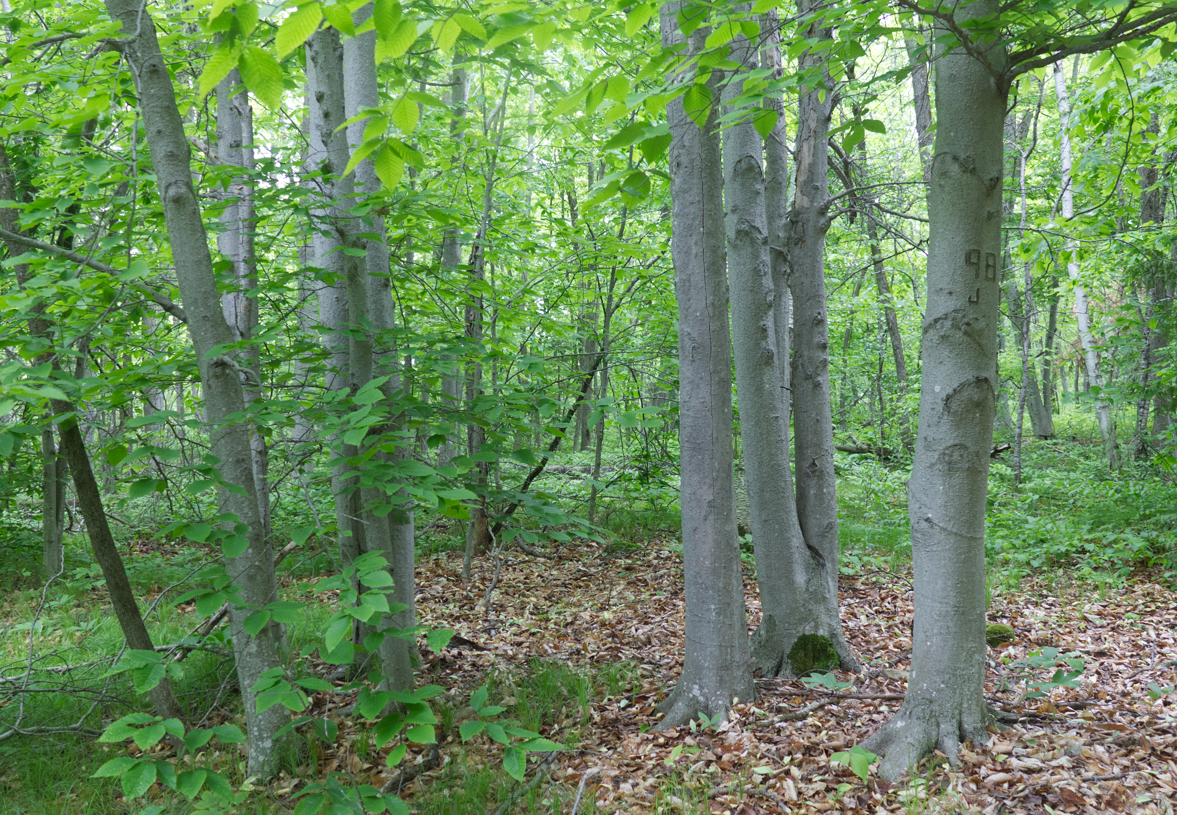 150-year old American Beech: the first large American Beech (Fagus grandifolia), about 110 m north of the entrance and well into the hemlock forest, had a dbh (diameter at breast height) of 59 cm, putting it at 100-150 years old; though beech trees with this dbh can be as old as 250 years (for instance, a beech tree with 51 dbh in the Backus Woods of Ontario (off Lake Erie) was aged through core at 204 years). Despite its considerable girth this beech retained its smooth slate grey bark, though with some ripples and warts. Bright green mossy socks were weaving themselves over its feet, particularly on its north side. Wohlleben tells us that you can estimate the age of a beech tree by observing how far up the green growth is on the trunk. Another way is by observing how wide the tree has become. Wohlleben notes that, just like people, trees stop growing tall and instead get wider with age. Taken together, these characteristics support my age estimate from the tree’s dbh at slightly over middle-age.