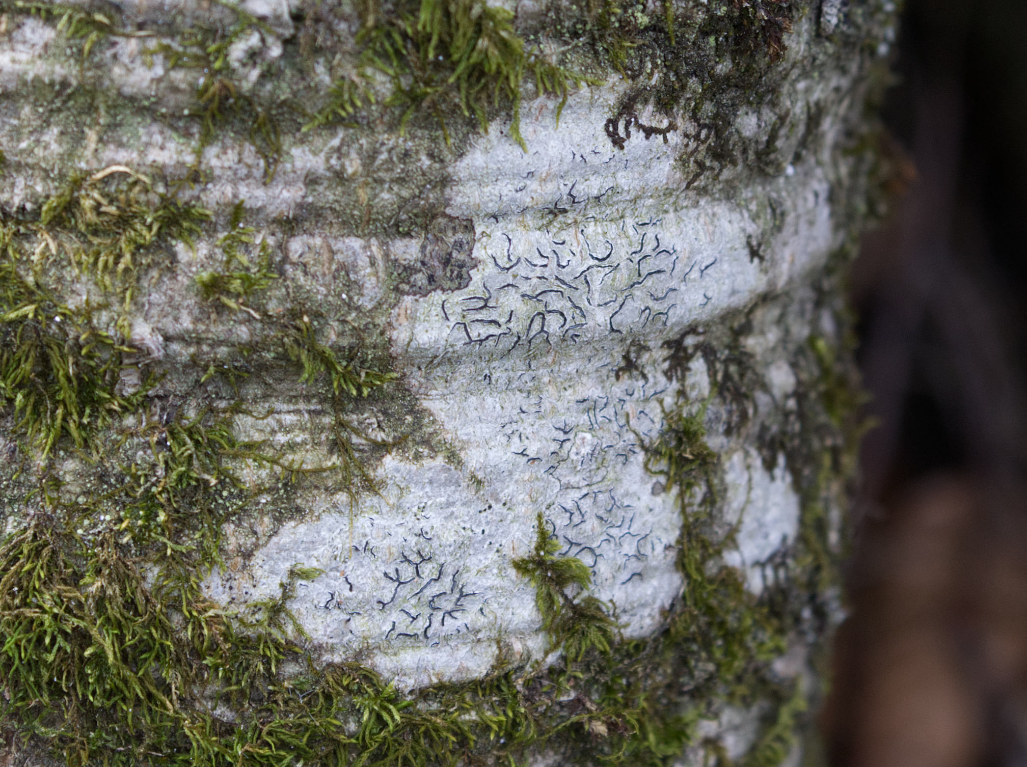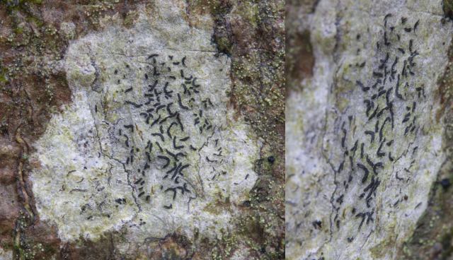The Comma Lichen, Arthonia excipienda was scattered throughout the beech trunk, forming dense colonies in some cases of little bean-shaped black-brown naked apothecia that resembled lips. Italic 8.0 describes this corticolous crustose lichen as having an endosubstratic thallus (e.g. invisible because it lies inside the bark) with arthonioid (without a true margin) and mostly lirelliform apothecia (fruiting bodies that are “lip-shaped”—elongated, straight or curved, rarely branched, with a furrow or ridge running down their middles).