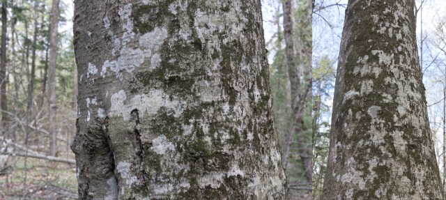 The beech trees in the Mark S. Burnham Old-Growth Forest can be quite old with thick trunks that stretch their pale limbs to pierce the overstory over 30 metres high. Several beech trees are well over two hundred years old. They have every right to be gnarly, grumpy and rough. As beech trees age, this is exactly what happens. Even without the onslaught of various diseases that cause cankers and splits in the smooth bark, old beech trees develop rough bark, with wrinkles, ripples and cracks and warts, often clothed in thick moss, liverworts and, of course, lichen. And the lichen I found—mostly crustose—varied from tiny purple-black dots on the oil-slick mosaics of pox lichen to script lichen’s dark blue squiggly hieroglyphics on whitish-grey parchment.