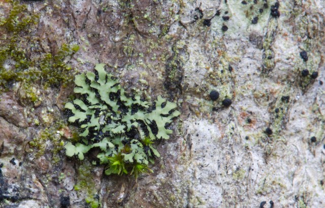 Both trees showed vertical stratification, with mosses and liverworts concentrated at the tree base and some lichens more obvious as one moved up the tree or on upper branches.
