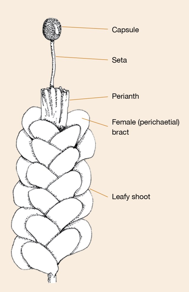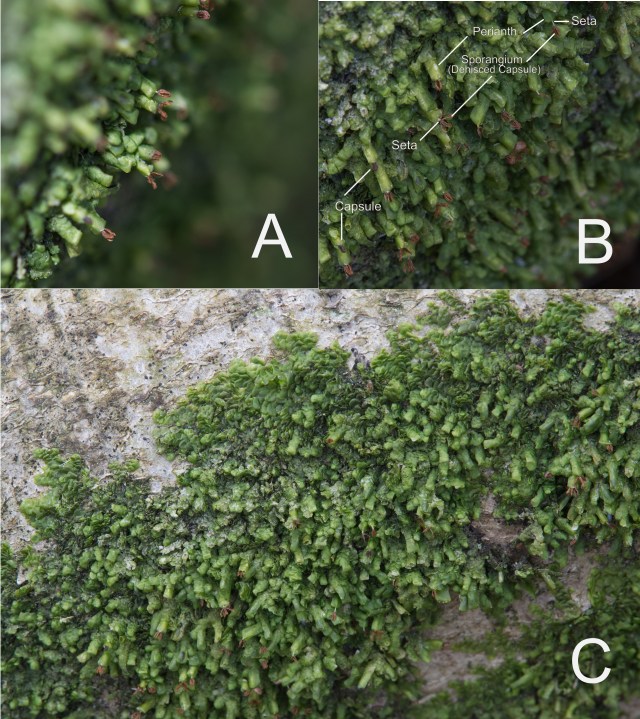 Flat-leaved Scalewort is often found in damp, shaded areas, and plays a significant role in nutrient cycling and carbon fixation. When I had a closer look at this creeping plant, I noticed bluish and brown ‘blobs’ extending from the rectangular perianths. These I later learned were the capsules of sporophytes emerging from the fertile gametophyte to release spores when mature. The short seta elevates the sporangium above the perianth and when mature, the sporangium dehisces (splits open) along four lines of weakness in the capsule wall to disperse spores. Within the capsule, elators (tubular cells with spiral thickenings) help release the spores.