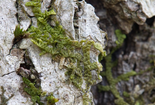 The feet of the 150-year old beech tree were sparsely clothed with bryophytes, dominated by Feather Moss and Tree Ruffle Liverwort. Shingle Moss (Neckera complanata) confined itself mostly to the tree’s feet in community. Feather Mosses and Bristle Mosses formed snaking lines along the trunk from the feet of the tree; the upper trunk was dominated by New York Scalewort (Frullania eboracensis), which formed large fist-sized rosettes, together with patches of Flat-leaved Scalewort (Radula complanata) and Tree Ruffle Liverwort (Porella navicularis).